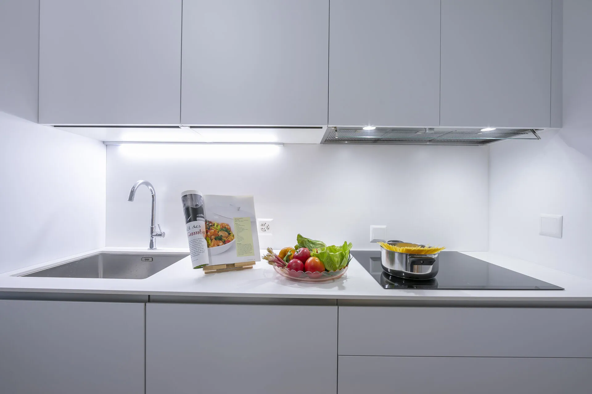 The sleek, modern, kitchen is fully equipped with everything you need for your stay: an induction hob, oven, microwave, dishwasher, fridge, freezer.