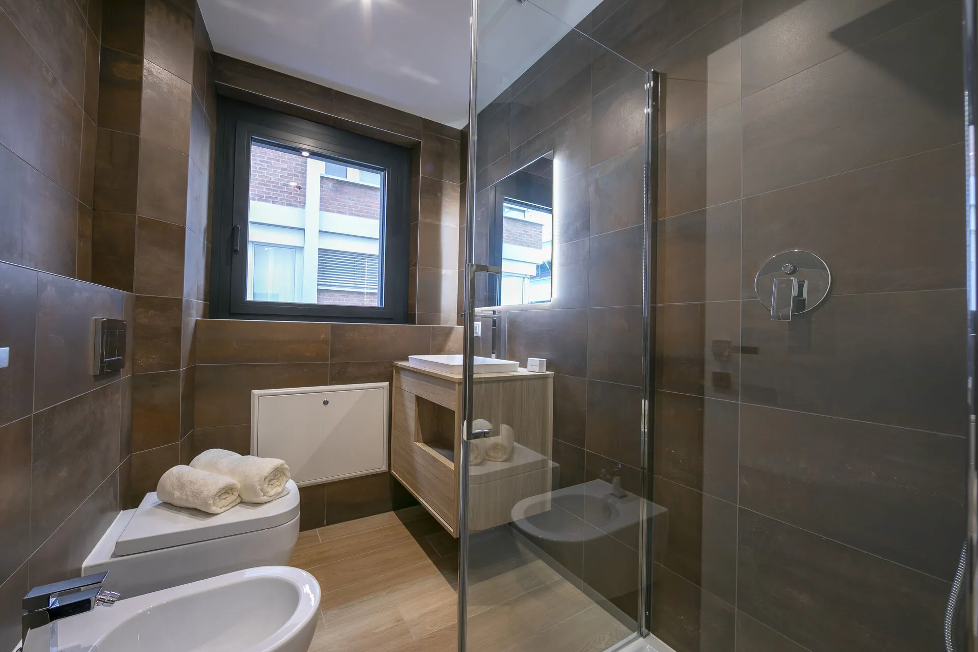A separate bathroom, next to the bedroom, with a glass shower, large basin, bidet and WC.
