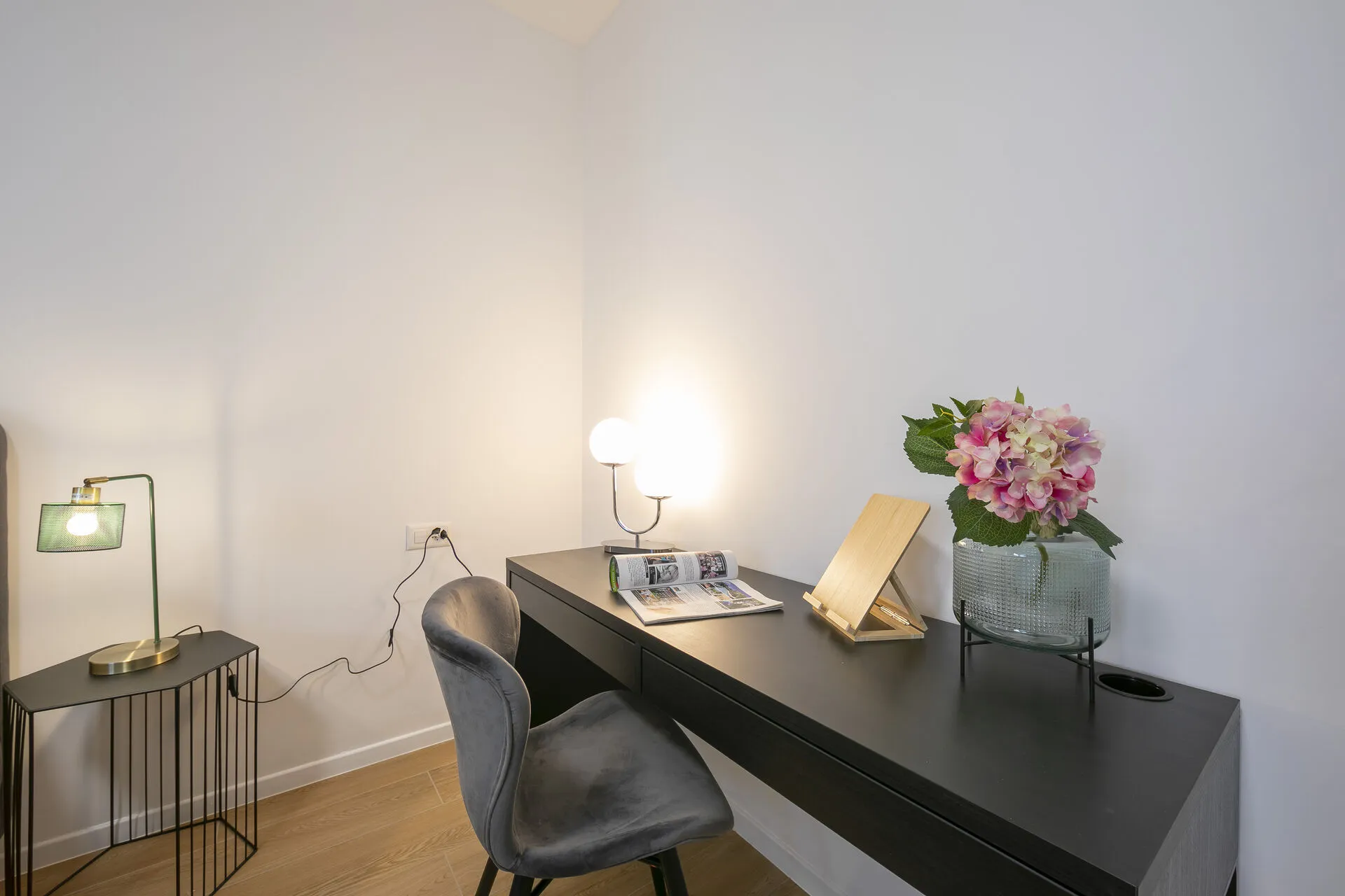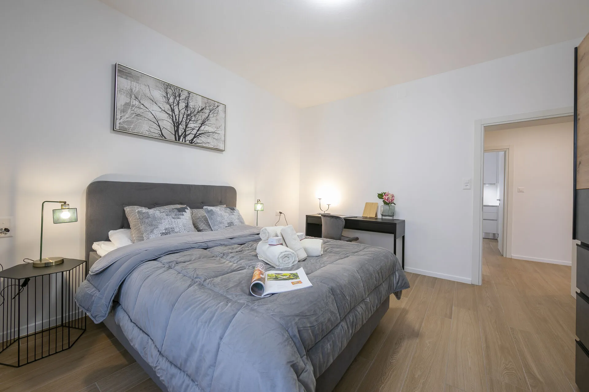 Bedroom 1: The bright master bedroom has a comfortable double bed, stylish storage, a large desk and a chair, as a workstation.