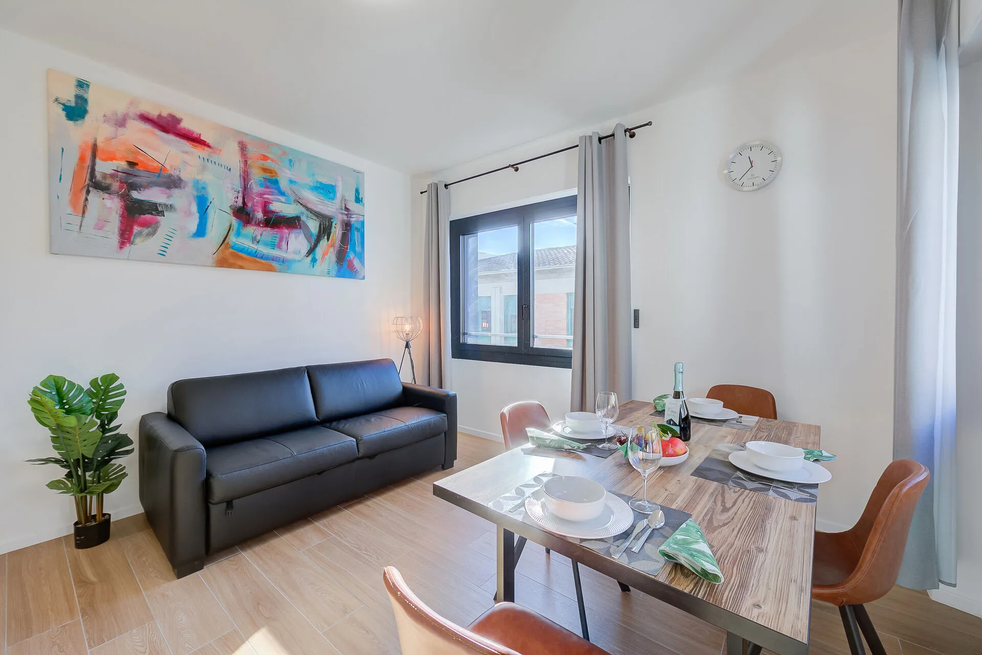 On the 4th floor (with lift) of an elegant apartment block, the air-conditioned apartment sleeps 4 people. It is flooded with sunlight and has been thoughtfully equipped with anything a guest might need for their stay. With wooden floors throughout, the apartment is arranged around a spacious entrance hallway. The corner living room has large windows on two walls and a glass door, leading onto a balcony overlooking the street. There is a comfortable sofa (which converts into a double bed), a large Smart TV and a contemporary dining table with 4 chairs. It is an ideal space to relax with friends or family.