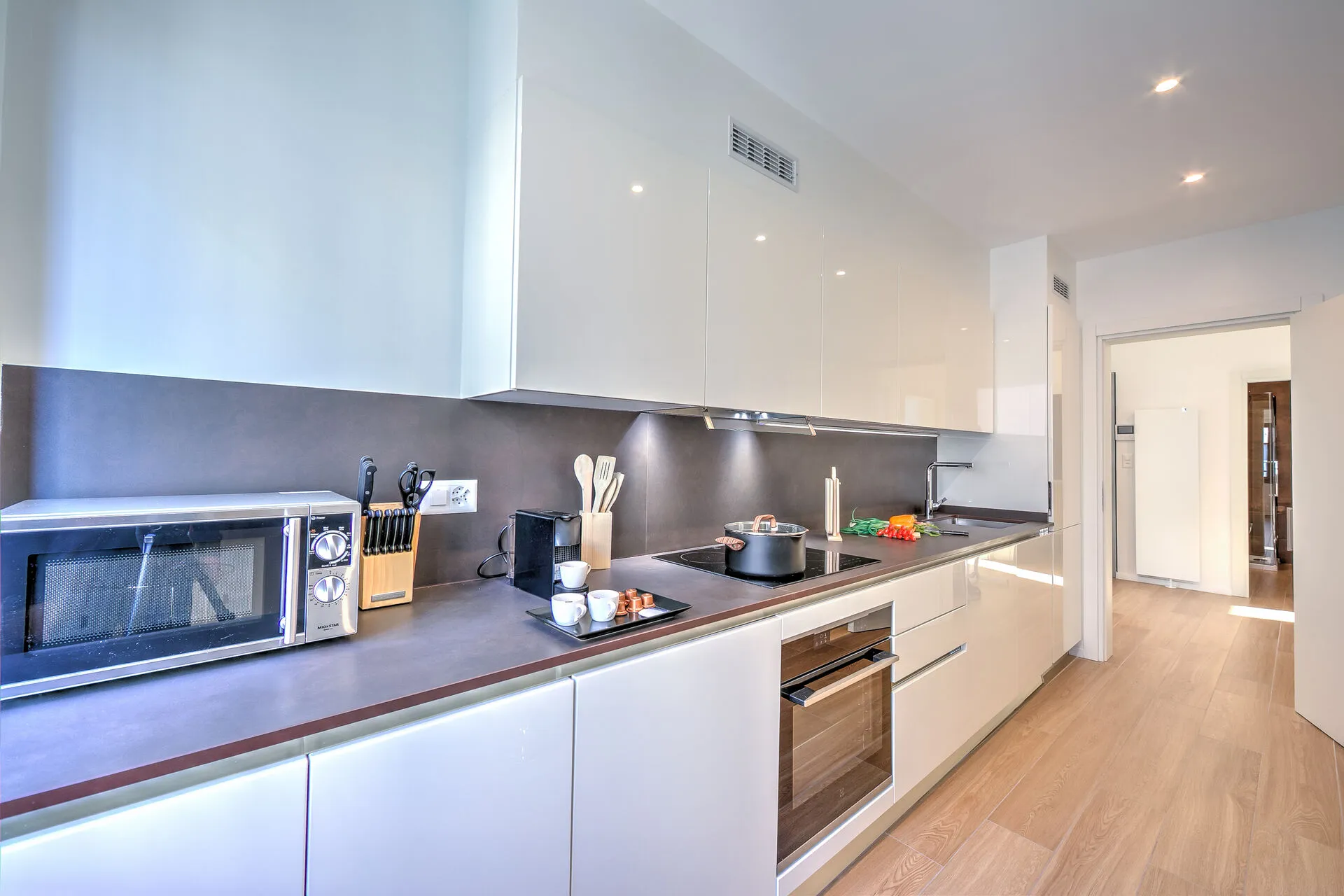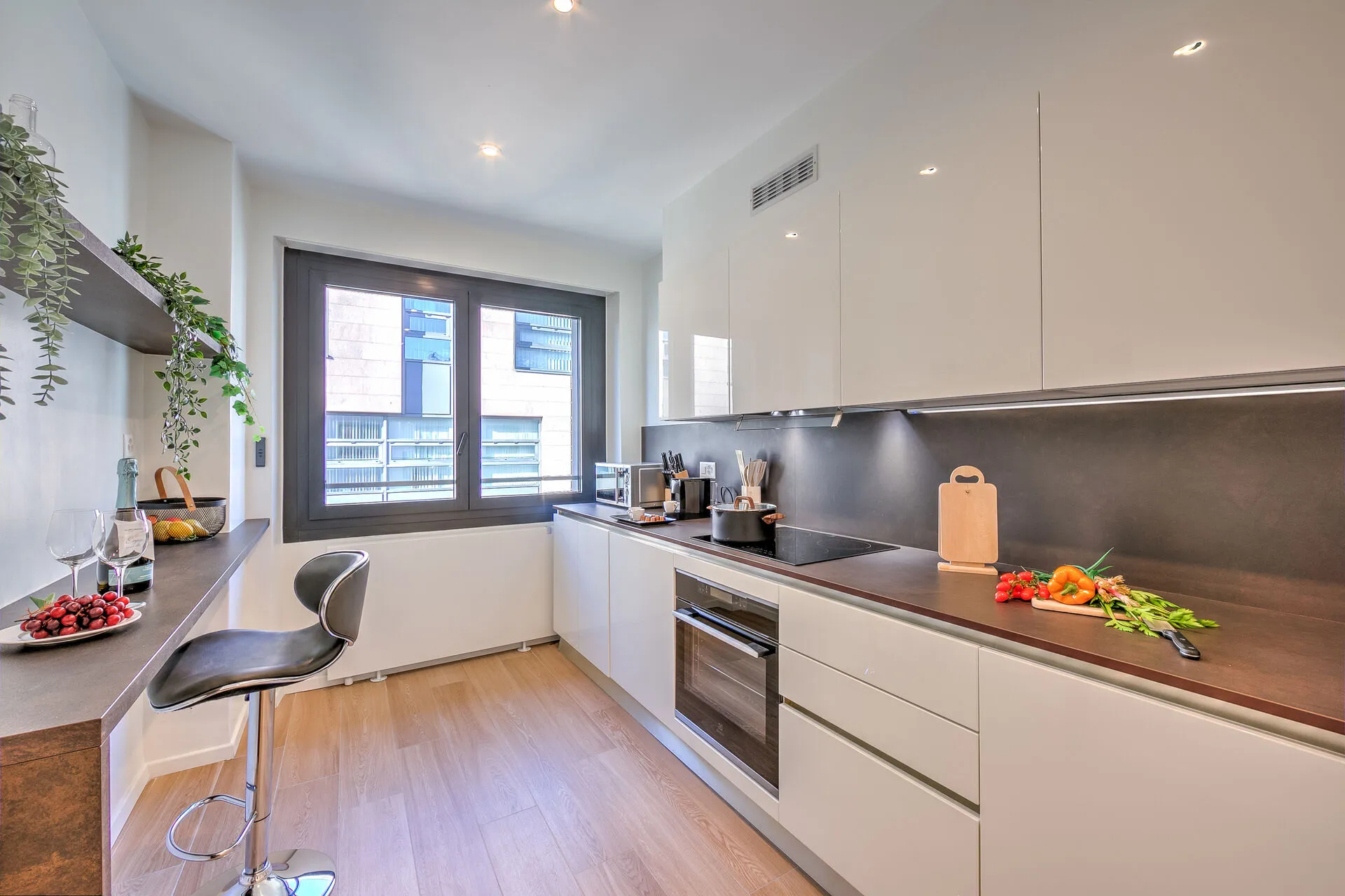 The fully-equipped, sleek, modern, kitchen has an induction hob, oven, microwave, dishwasher, fridge, freezer and a Nespresso machine, plus a small breakfast bar.