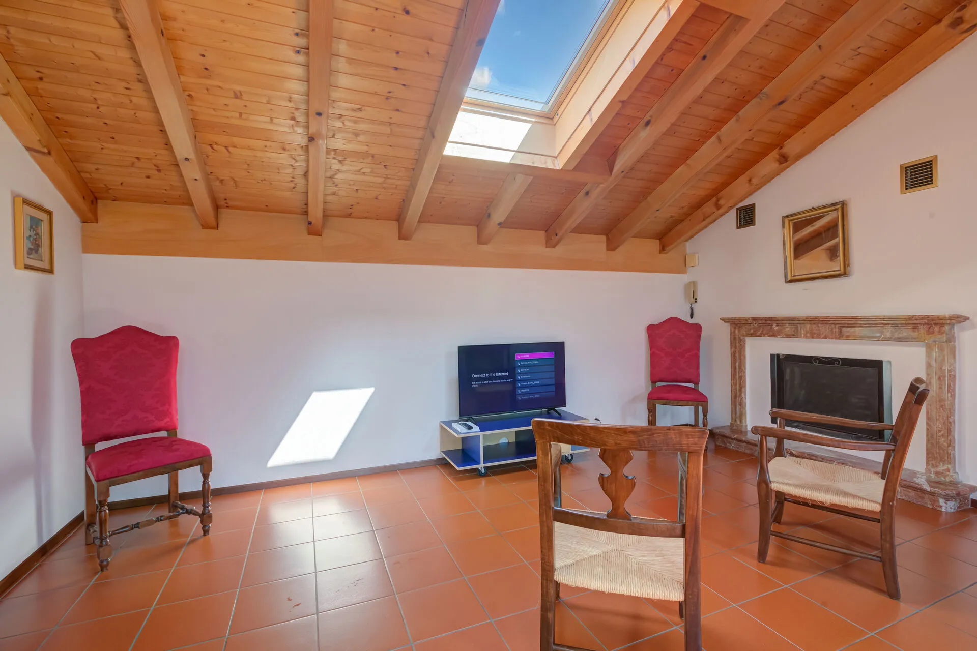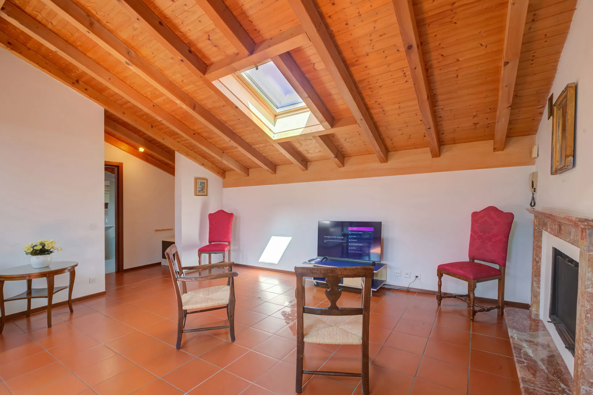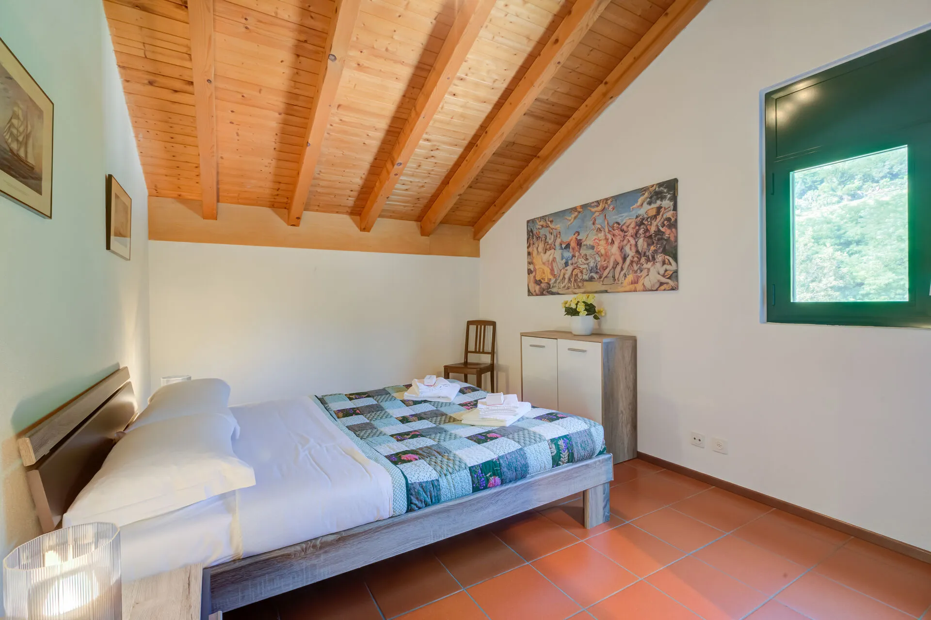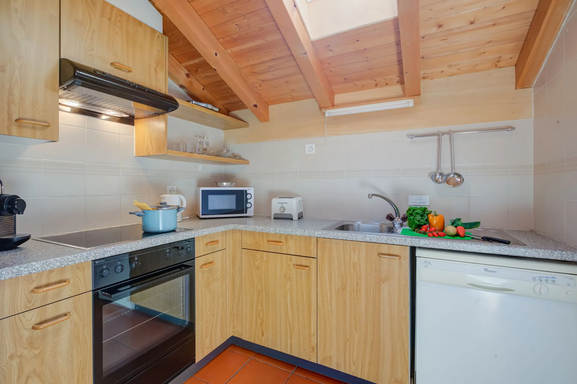 With high wood-beamed ceilings and a terracotta tiled floor, the property enjoys a characterful rustic style. With plenty of picture windows and skylights, each room is filled with natural light. The main open-plan living space is furnished with a comfortable sofa bed, a flat-screen TV, a dining table and plenty of chairs. The separate kitchen is fitted with; a cooker hob, an oven, a microwave, a coffee machine, a dishwasher and a fridge freezer.