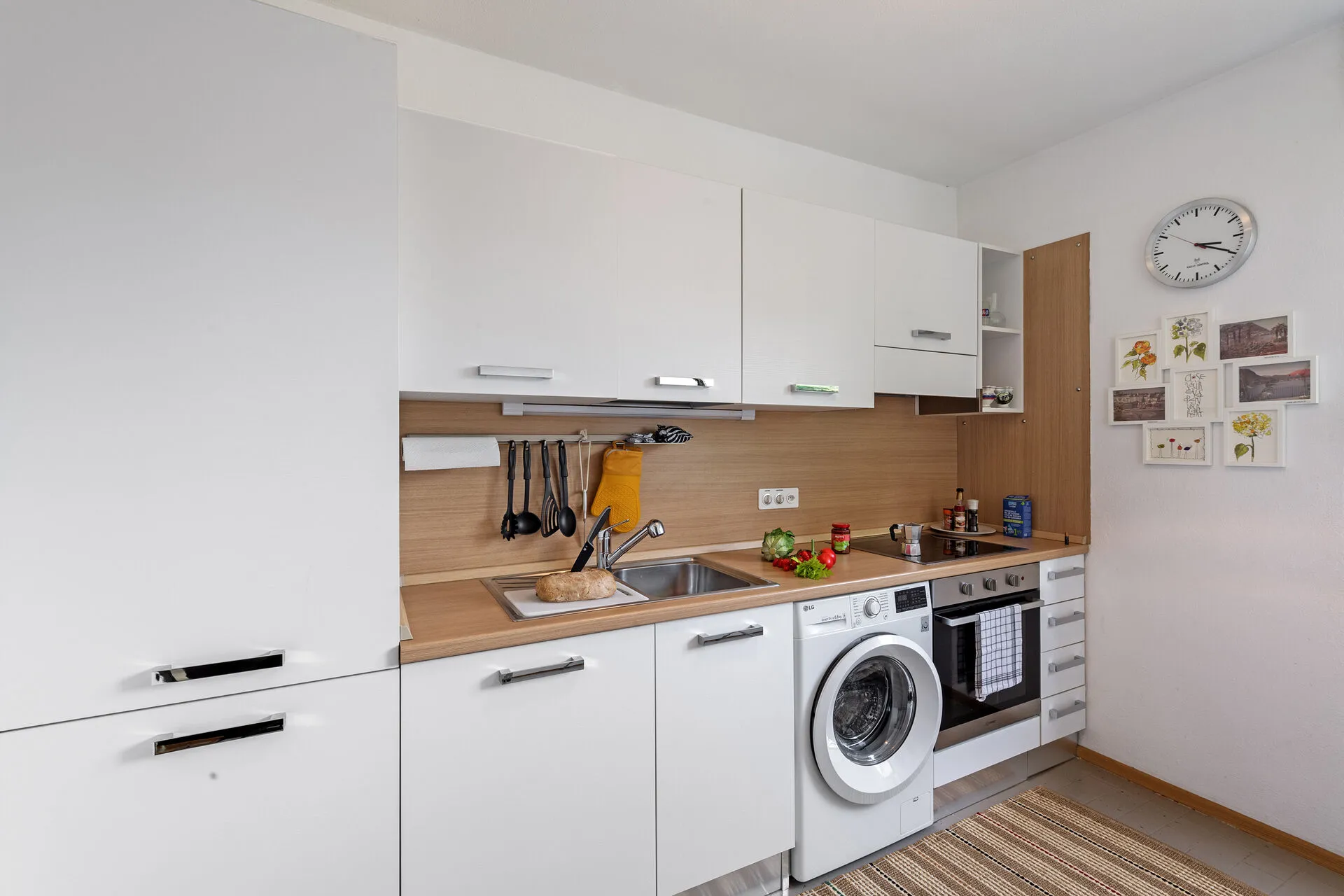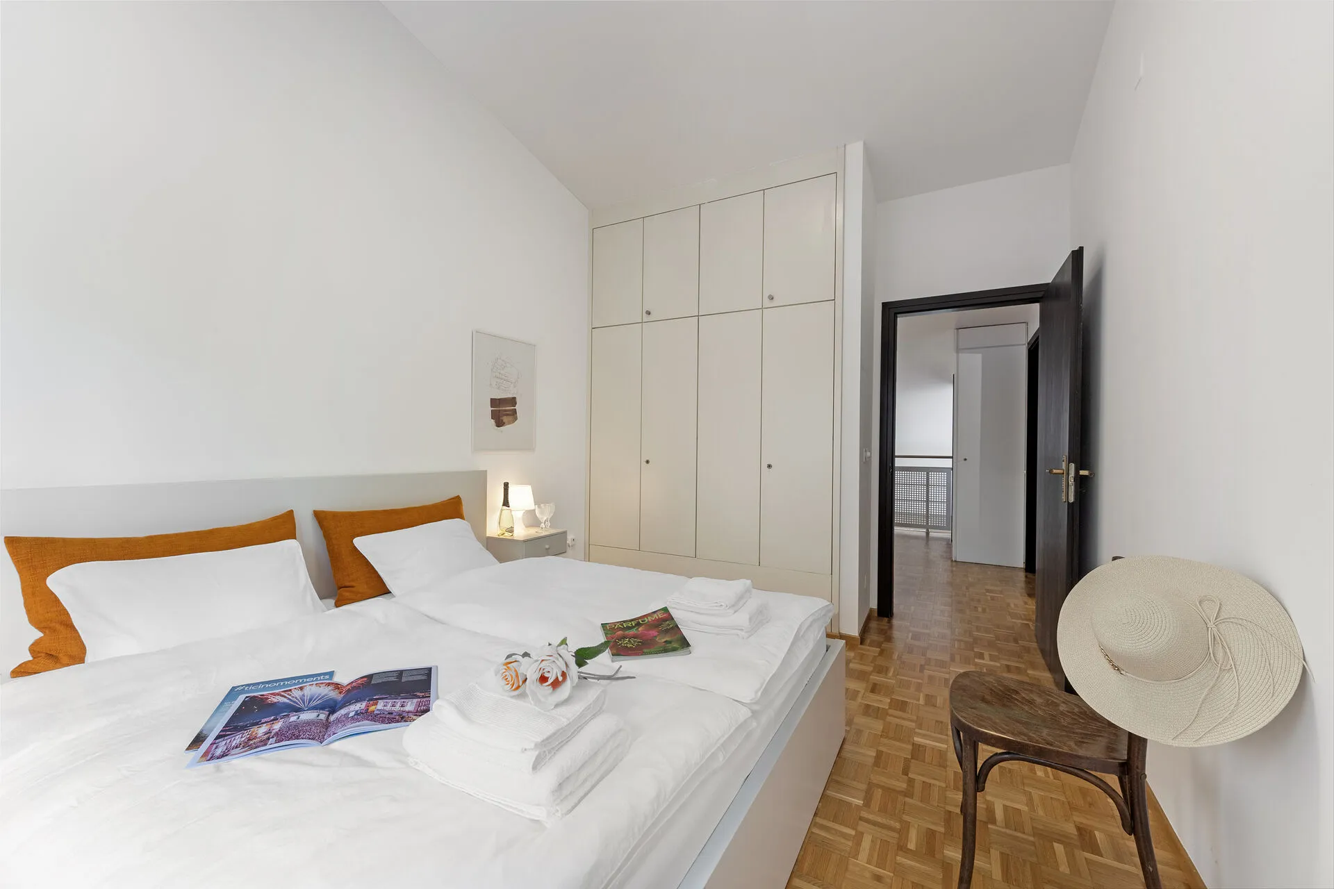 On the private terrace of the apartment, guests can enjoy dining in the open air, while inside they can unwind in a fully furnished space equipped with all essential amenities. The modern living room features entertainment amenities like a Smart TV and a book plus games library. The layout is completed by a modern dining table, and a fully equipped kitchen with a coffee machine, fridge with freezer, toaster, oven, induction hob and dishwasher at guests’ disposal.