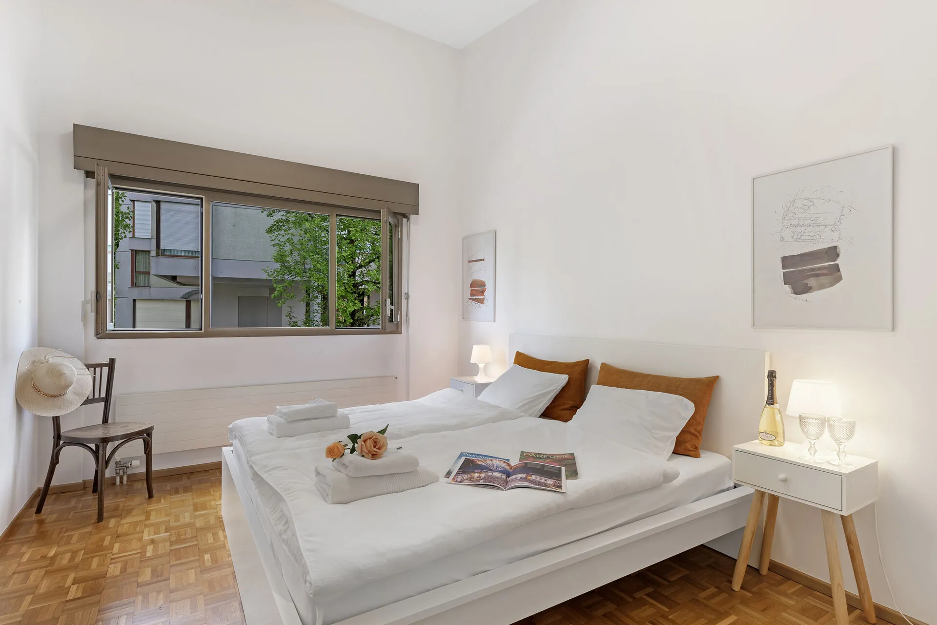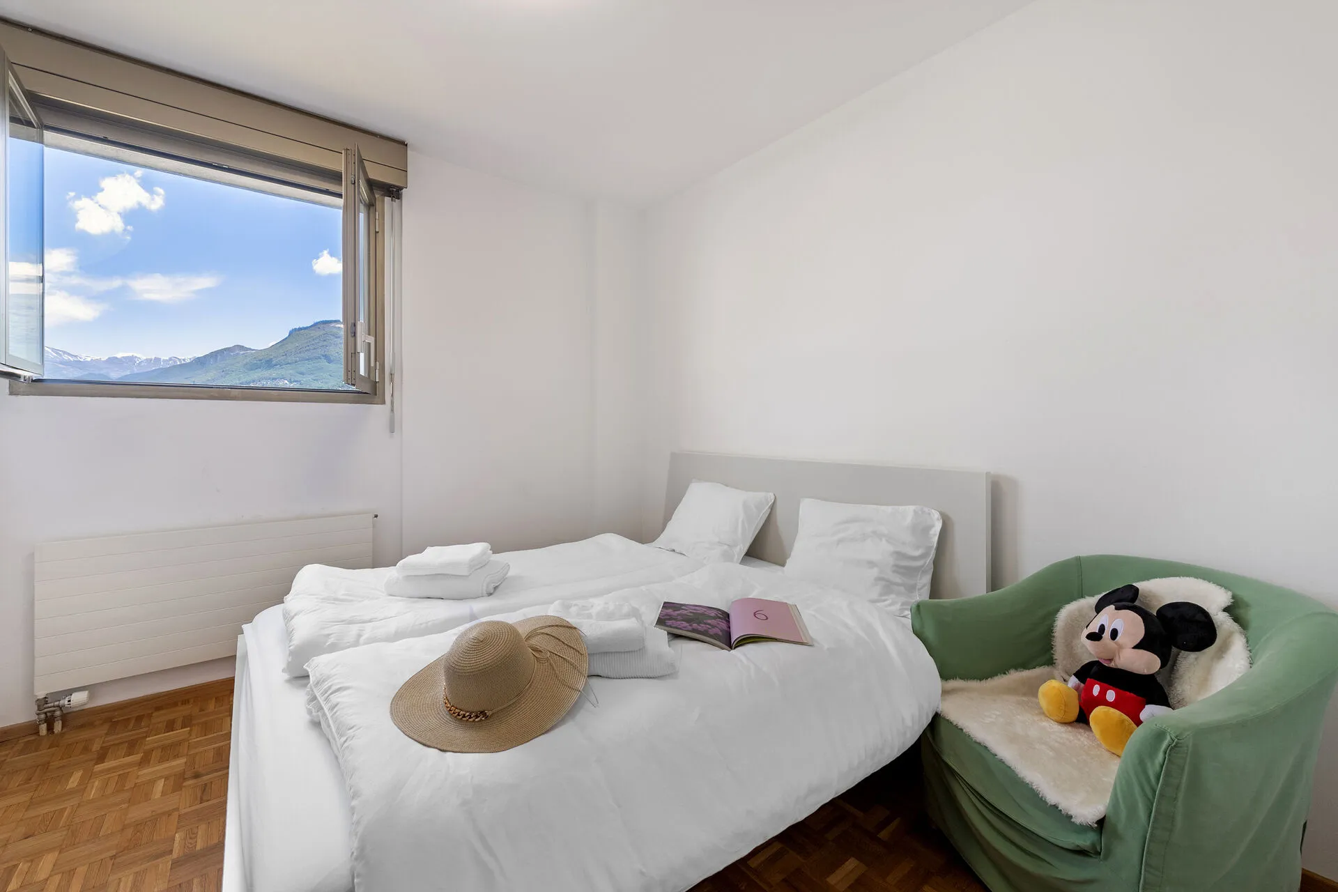 Bedroom 2: A bright bedroom with a double bed, large window and wardrobe.