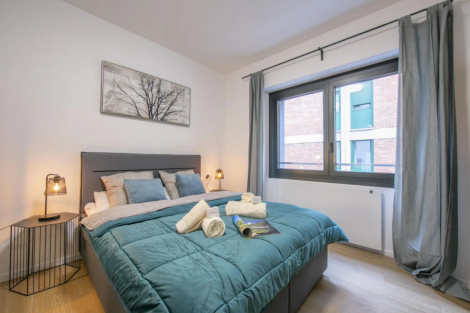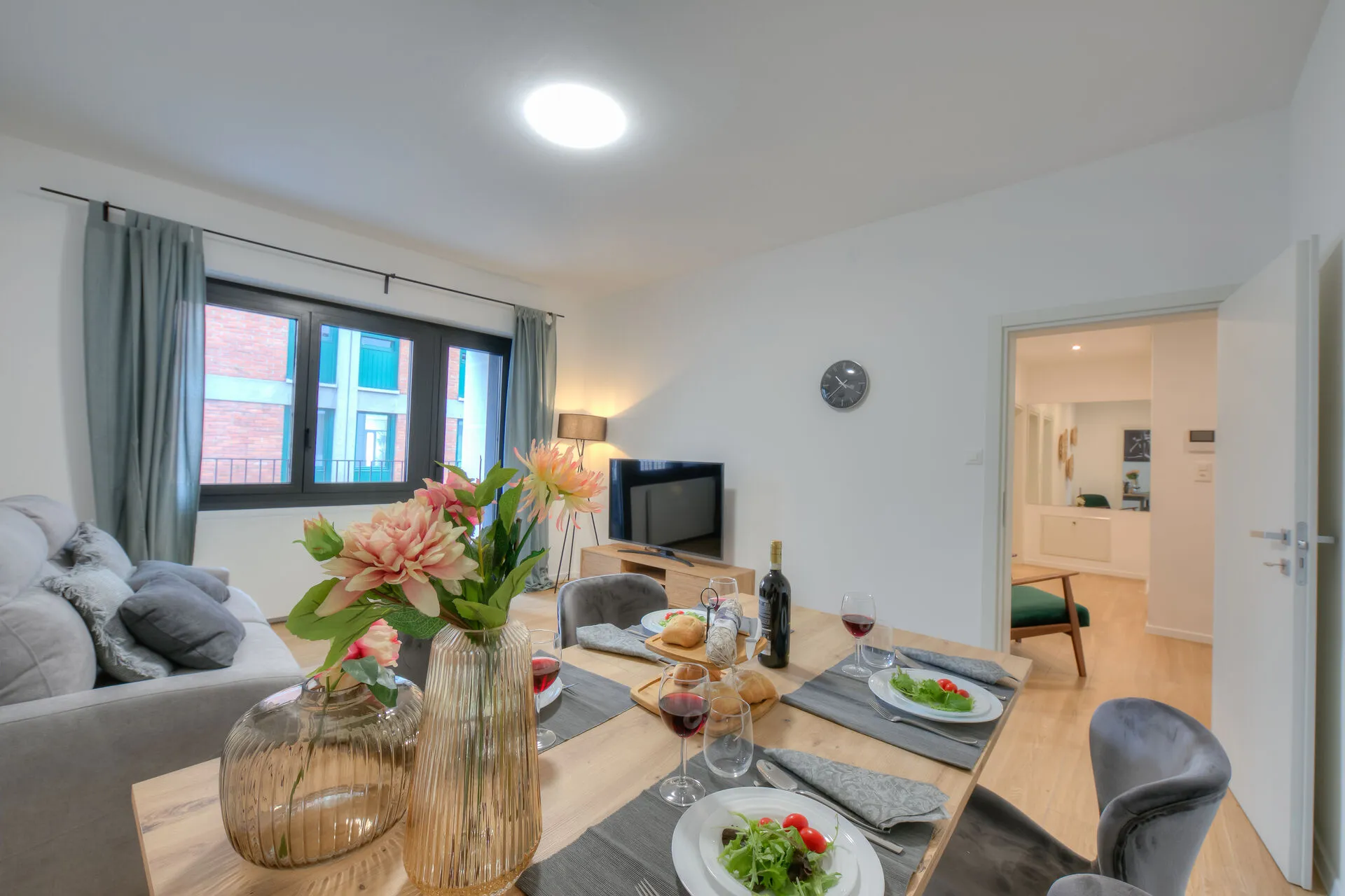 This newly built, 2 bedroom apartment, on the 1st floor of an exclusive block, sleeps 6 people in complete comfort. The air-conditioned apartment is arranged around a central hallway, with wooden flooring throughout. The spacious living/dining room has a French window leading on to a balcony, which looks out over the street. The room is chic and contemporary with a sofa (which converts into a double bed), dining table and chairs for 4 people and a large Smart TV.
