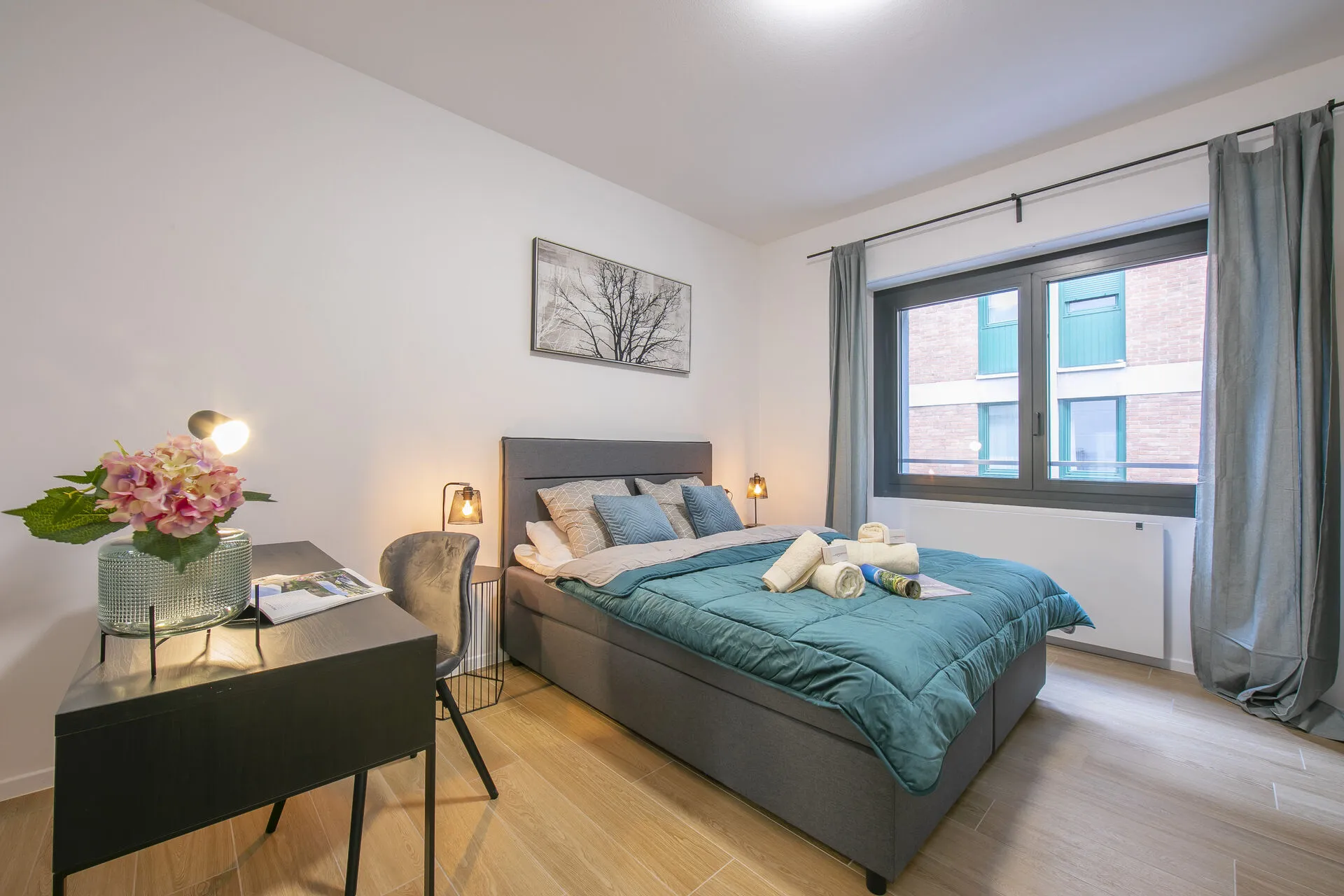 Bedroom 1: The bright master bedroom has a comfortable double bed, stylish storage, a large desk and chair, which can be used as a work station.