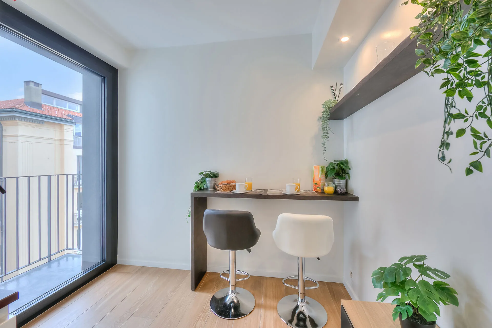 The spacious, modern kitchen has a breakfast bar next to the large glass door that leads out onto another little balcony. It is equipped with everything you might need for your stay: an induction hob, oven, microwave, dishwasher, washing machine, fridge, freezer and a Nespresso machine.