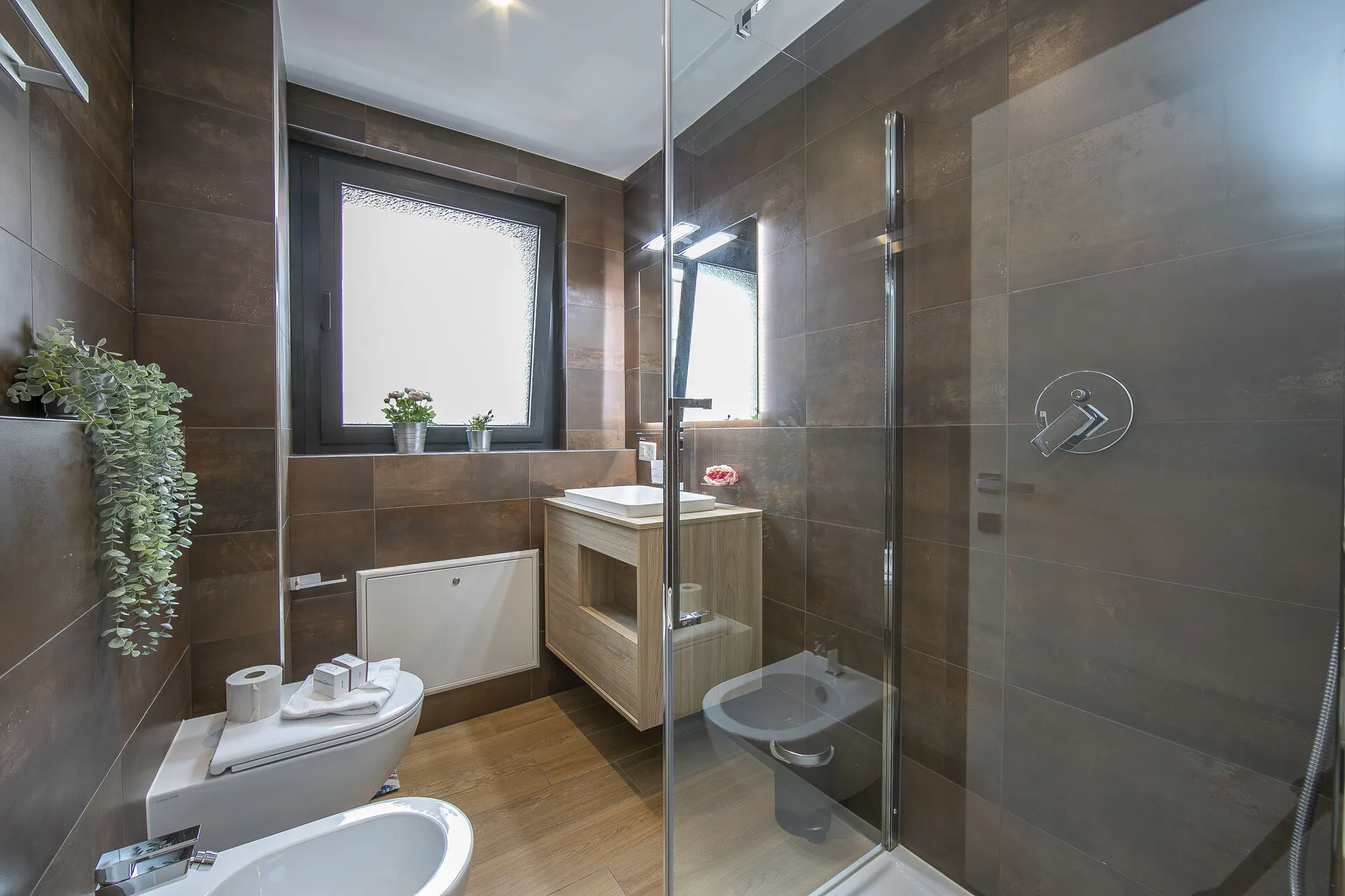 Bathroom 1: Next to the master bedroom this stylish bathroom has a glass shower, large basin, bidet and WC.