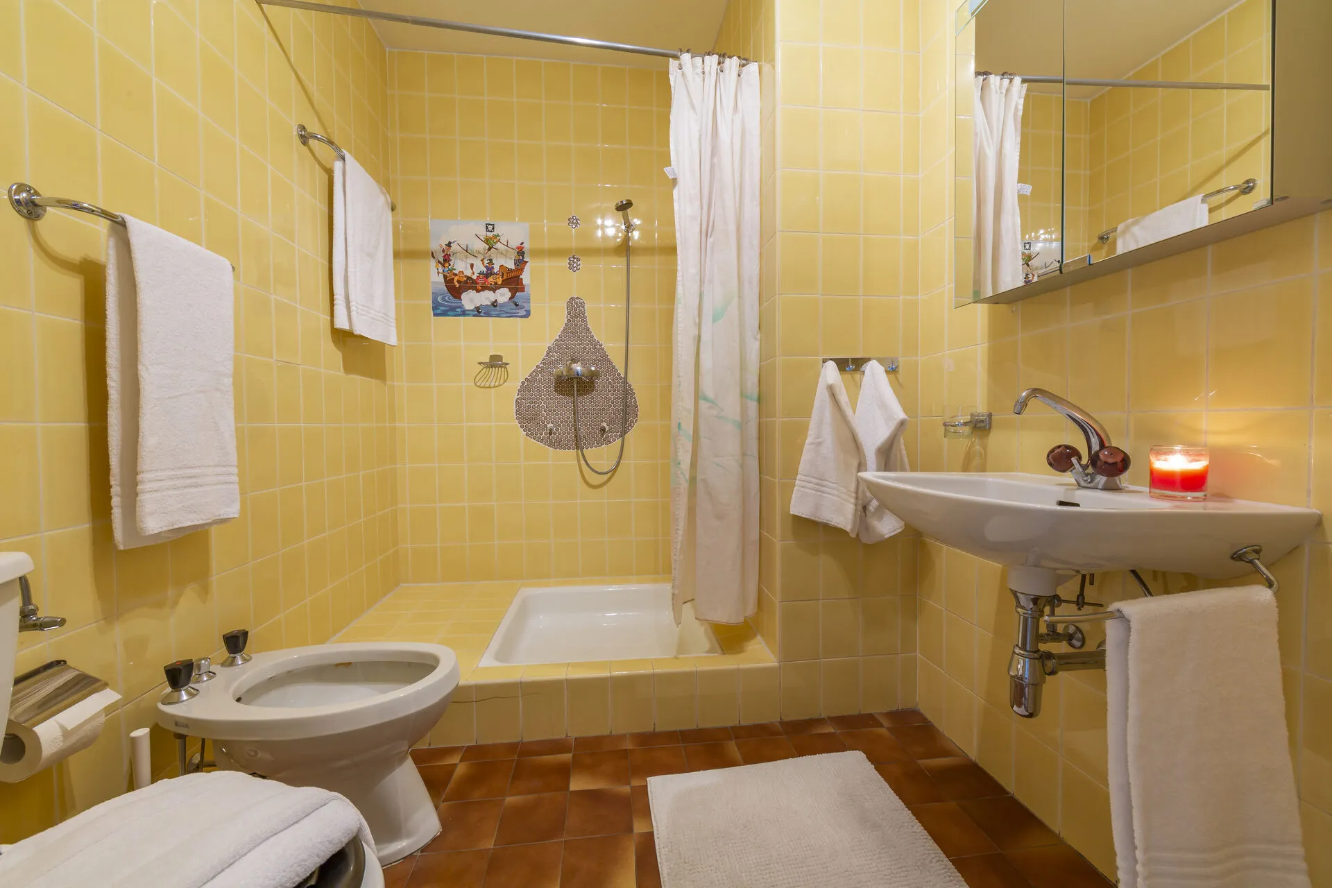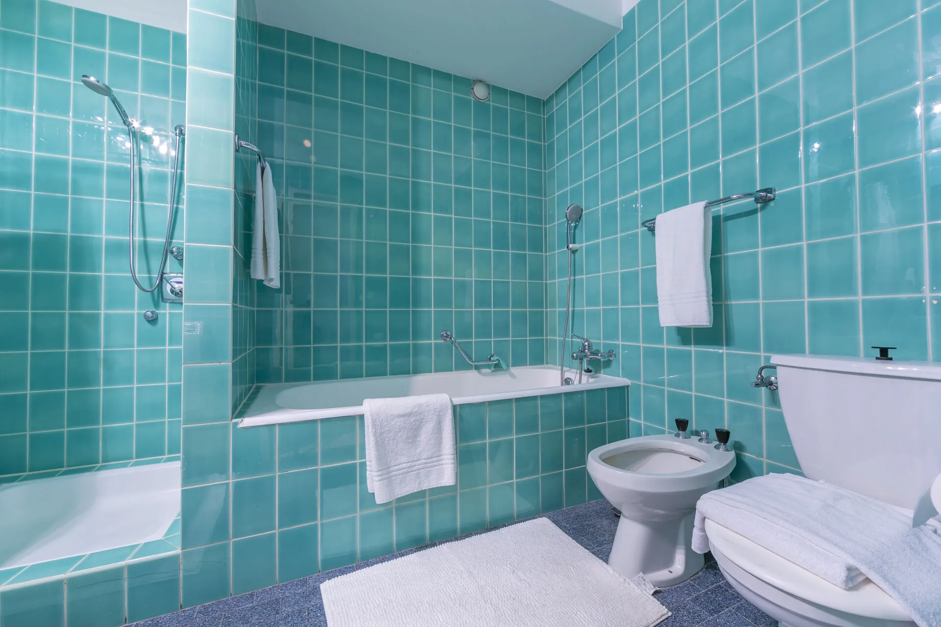 Bathroom 1: A full family suite with bath, overhead shower, wash basin, WC & bidet