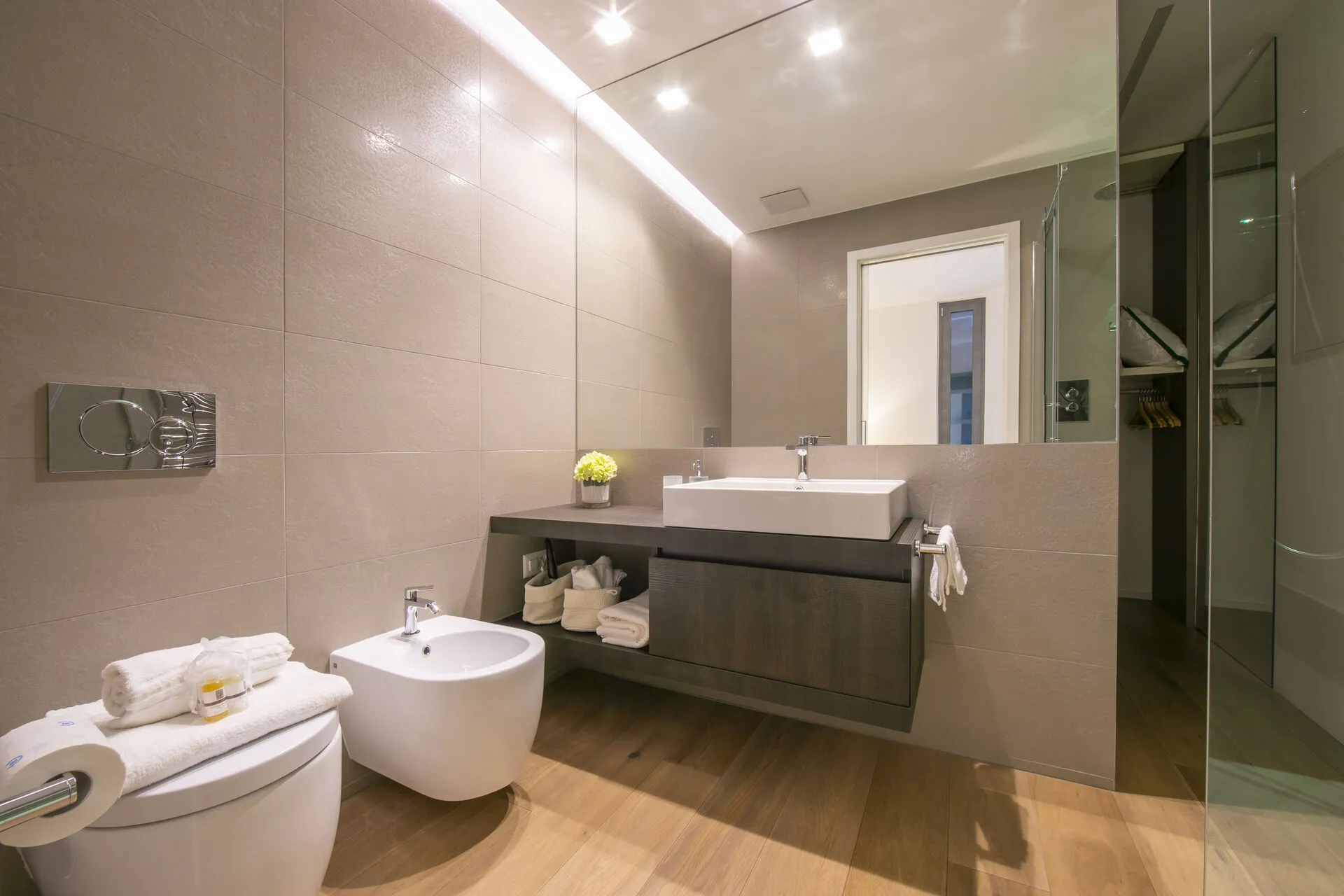 Bathroom 1: A sleek en-suite with ambient-lit walk-in shower, wash basin, WC & bidet