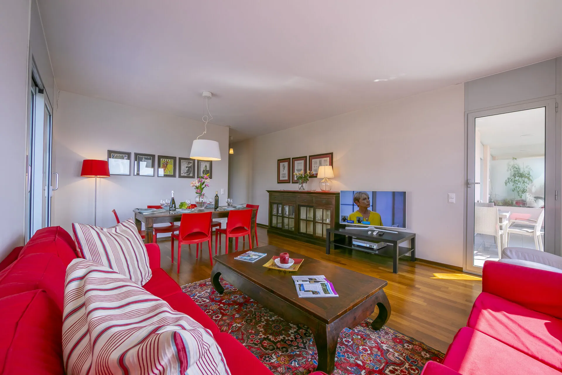 The three-bedroom apartment sleeps 6 people and is ideal for families. The light-filled corner living/dining room has two glass doors which lead onto the front balcony, where guests can relax on the sun loungers or dine al fresco and the side balcony, with views over the hills. Back indoors in the living room, there are two comfortable sofas, an armchair, a beautiful dark wood coffee table and a side-cupboard plus a widescreen satellite TV. The smart wooden dining table seats 4.
