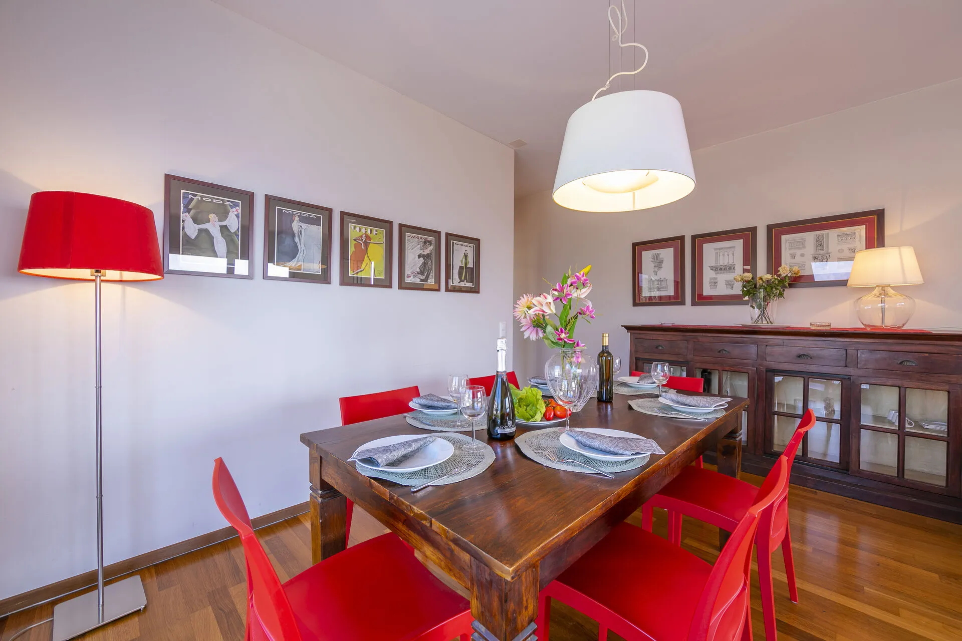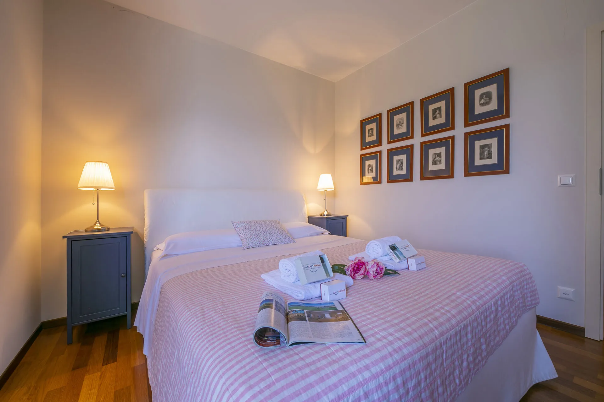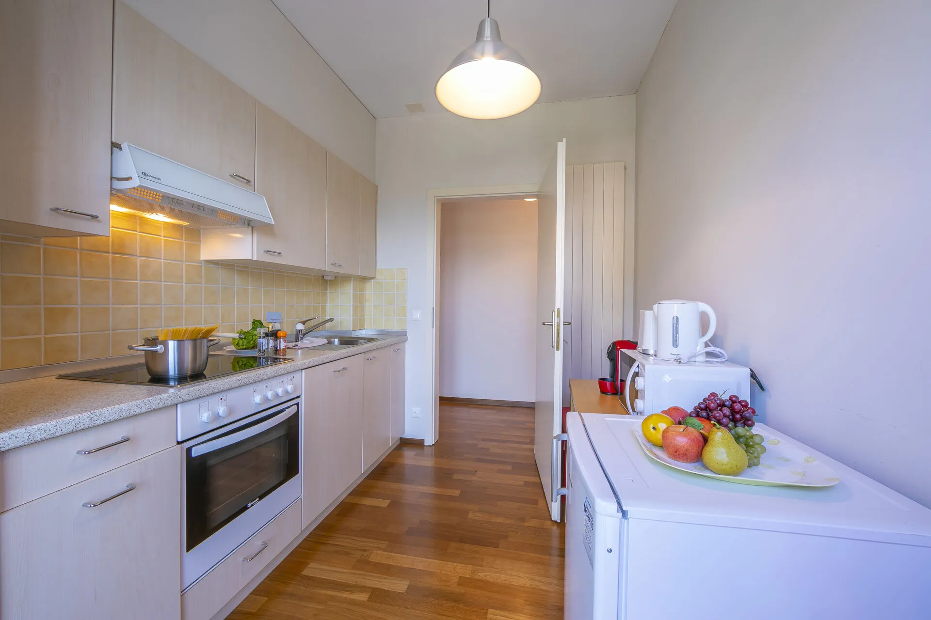 The bright kitchen, with fitted units and pretty tiles, also has French windows leading onto the side balcony. It is fully equipped with an induction hob, oven, microwave, dishwasher, fridge-freezer, toaster and a Nespresso coffee machine.