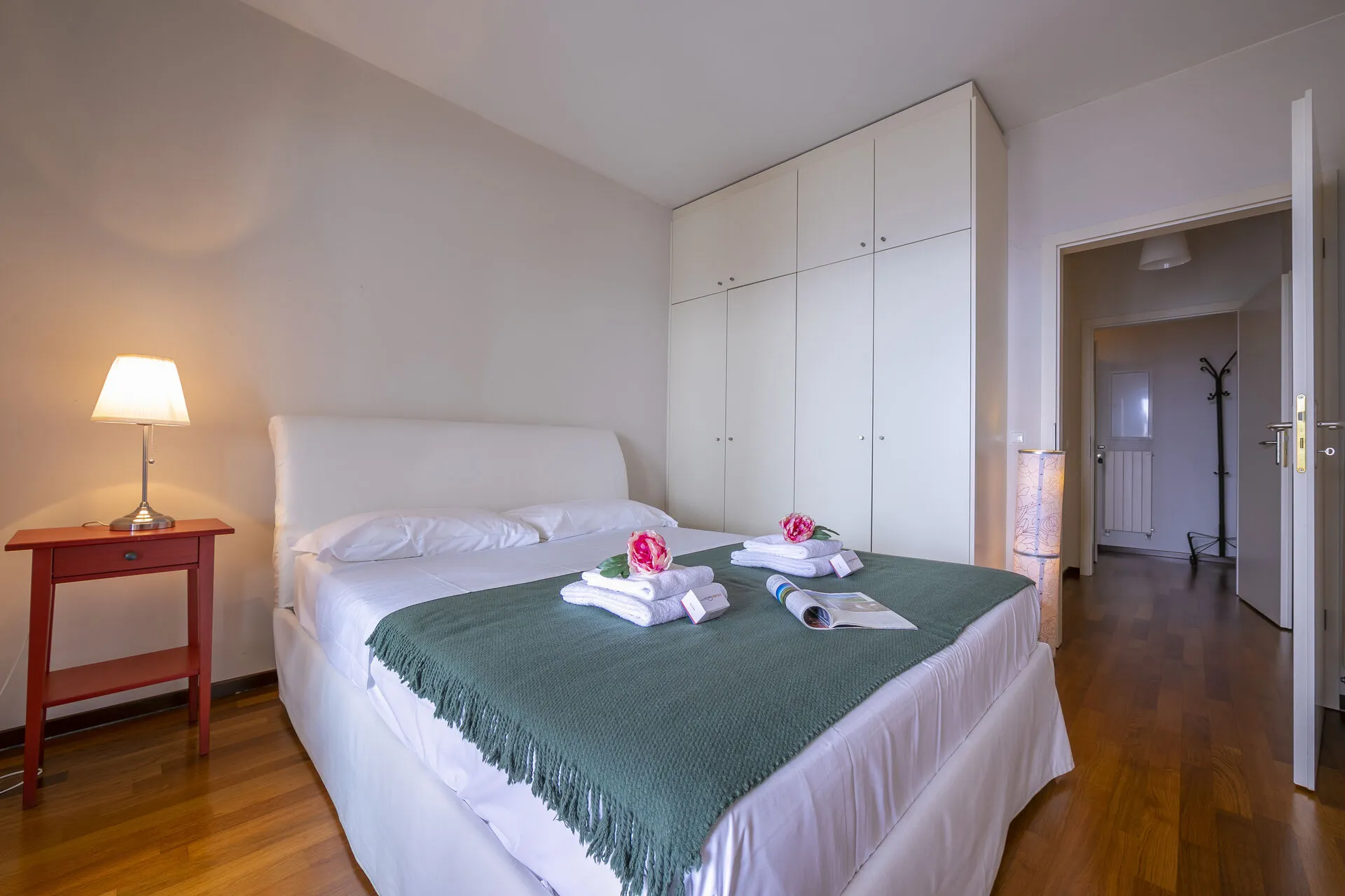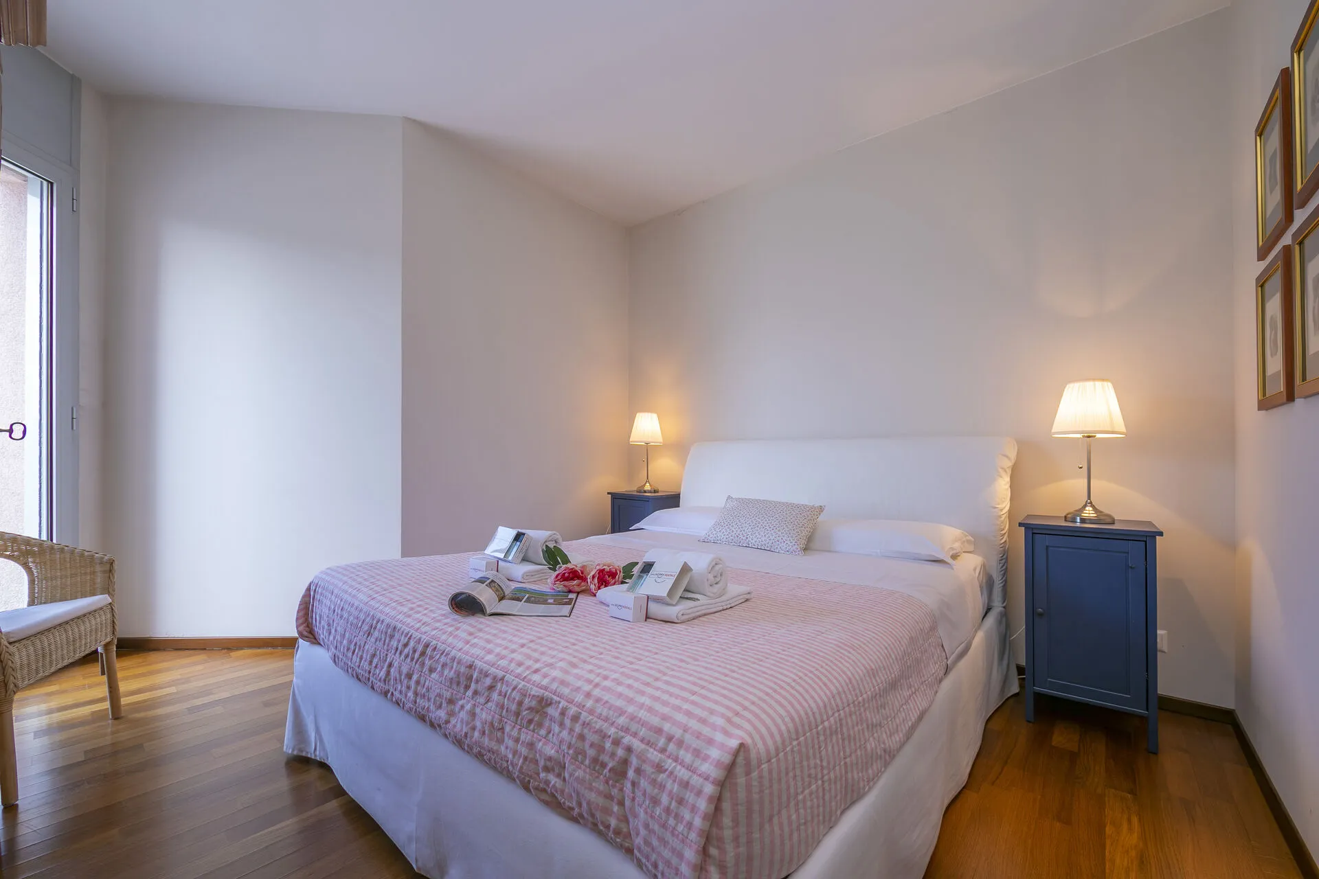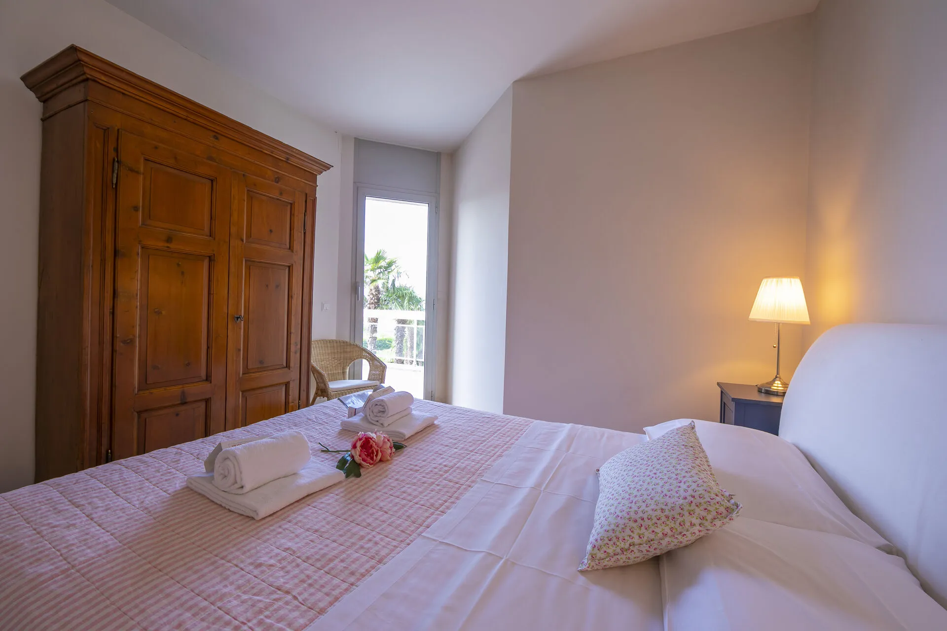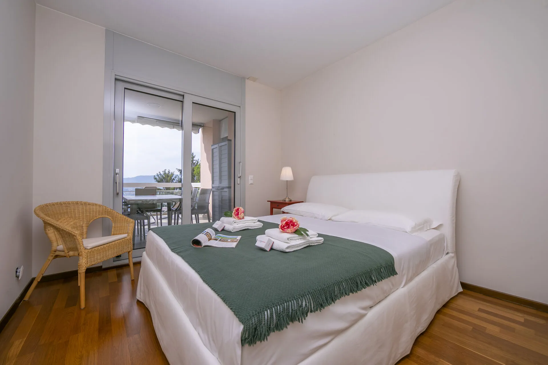 Bedroom 2: A fresh bedroom with a double bed, a traditional wooden wardrobe and a glass door out onto the balcony with views out over the lake.
