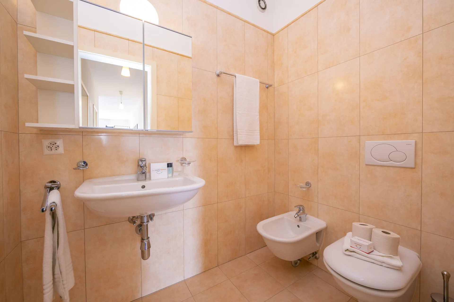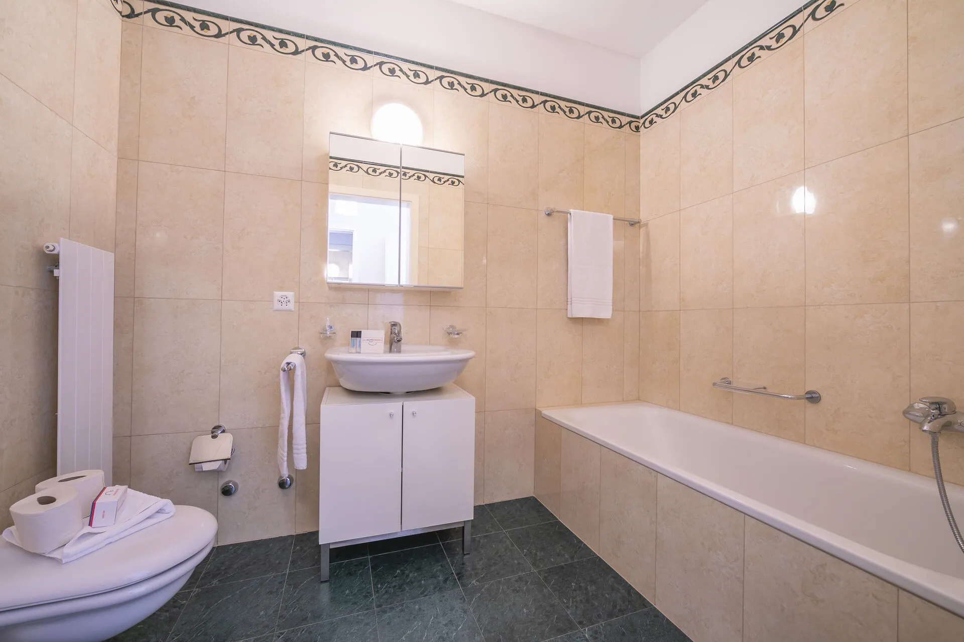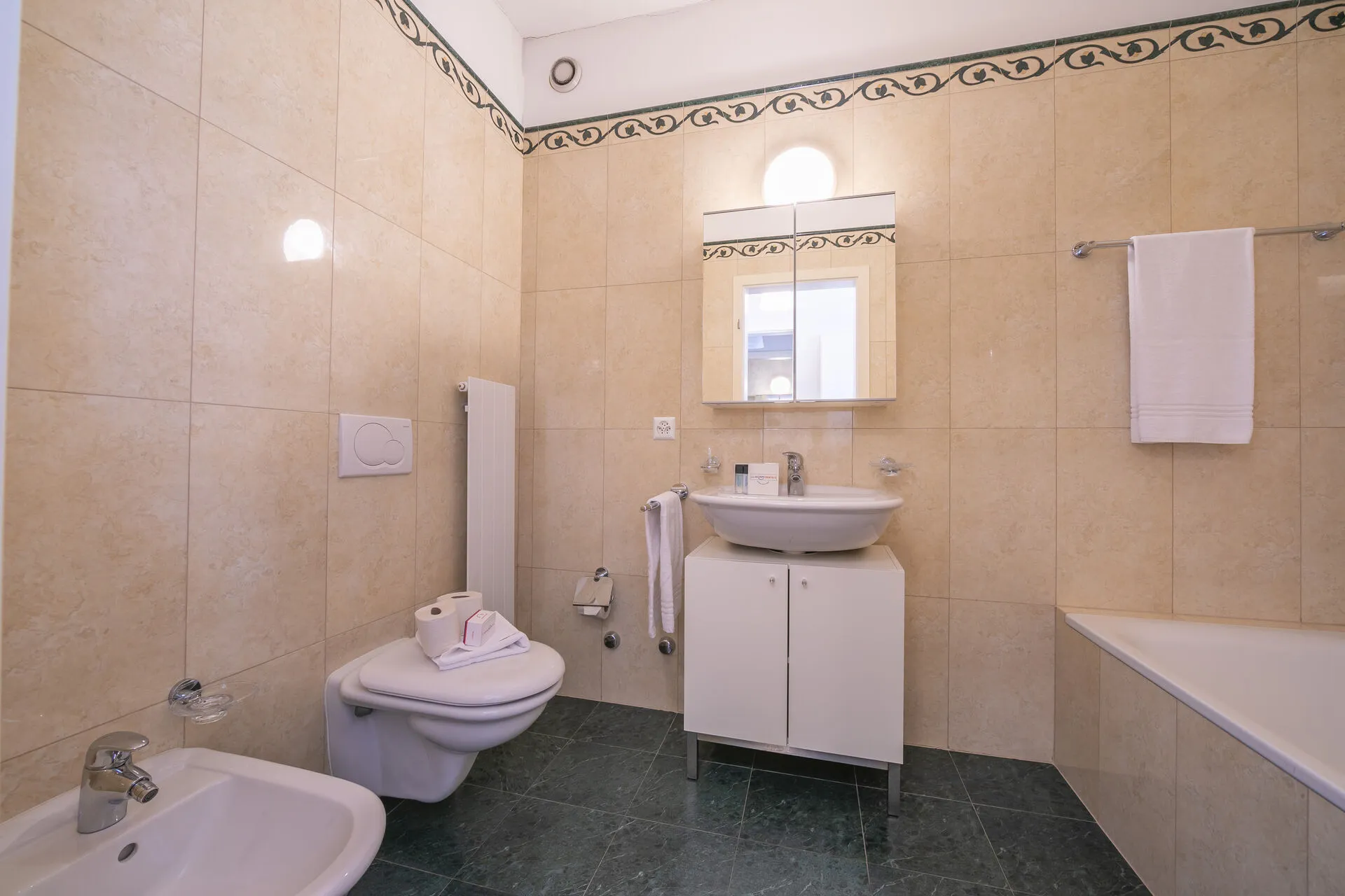 Bathroom 1: An en suite bathroom for bedroom 1. This pretty tiled bathroom has a full bath with a shower, bidet, basin and WC