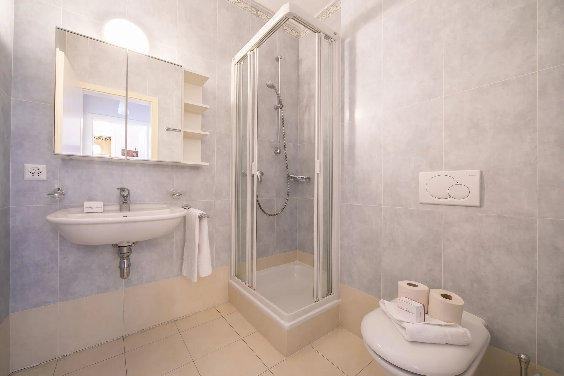 Bathroom 2: A shared bathroom with a glass shower, basin and WC.