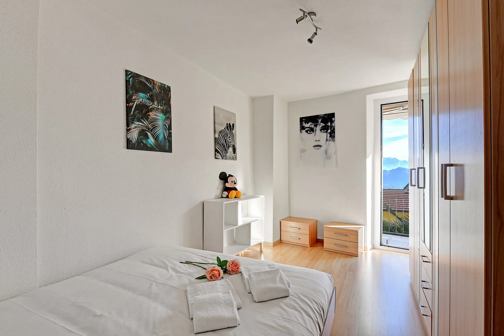 Bedroom 1: The light-filled master bedroom is furnished with a double bed and extensive wardrobes. A glass door leads out to a private balcony with stunning views.