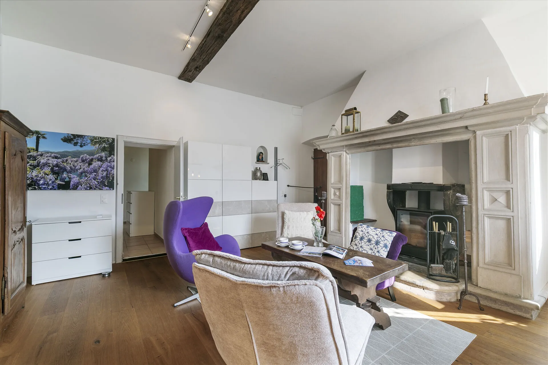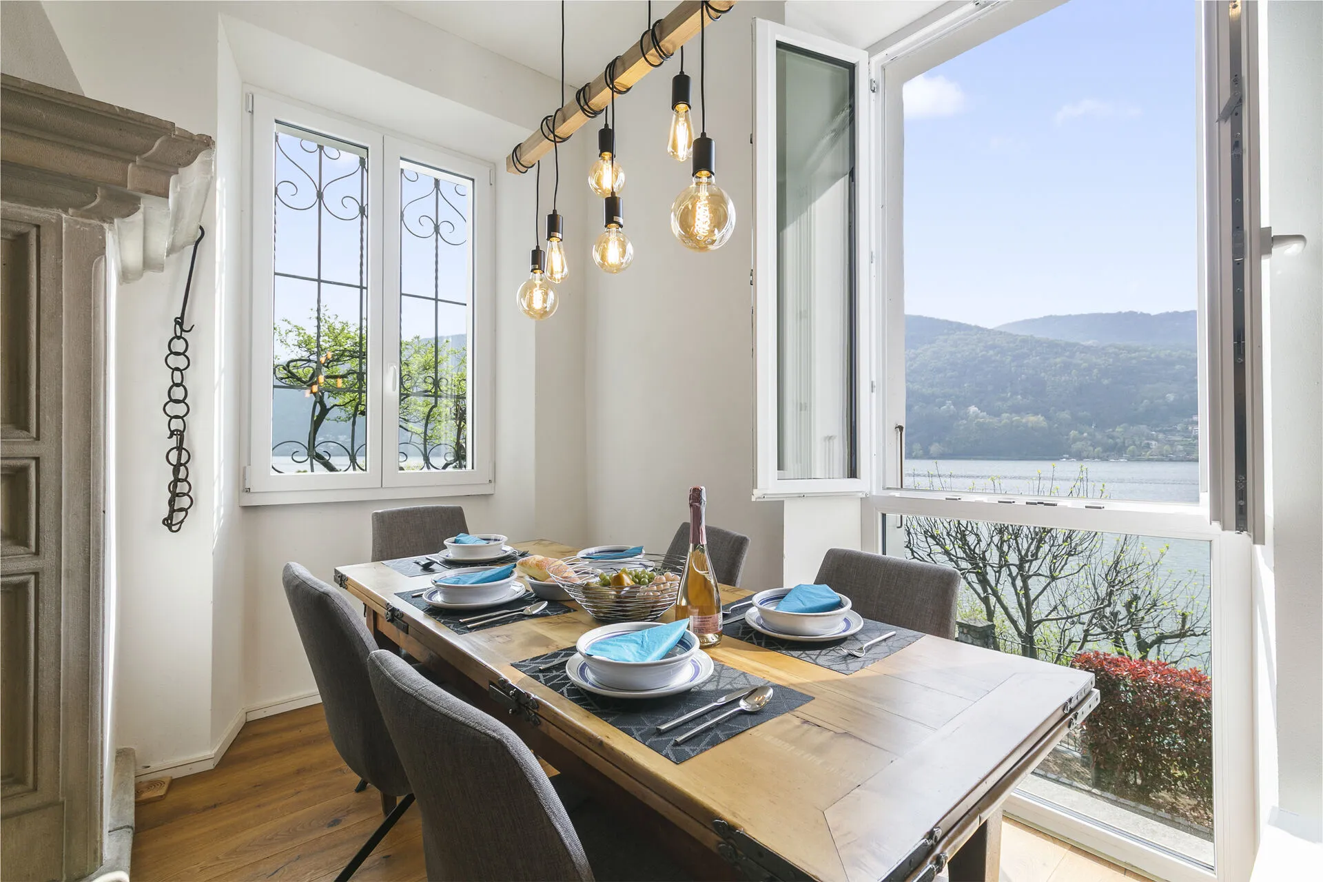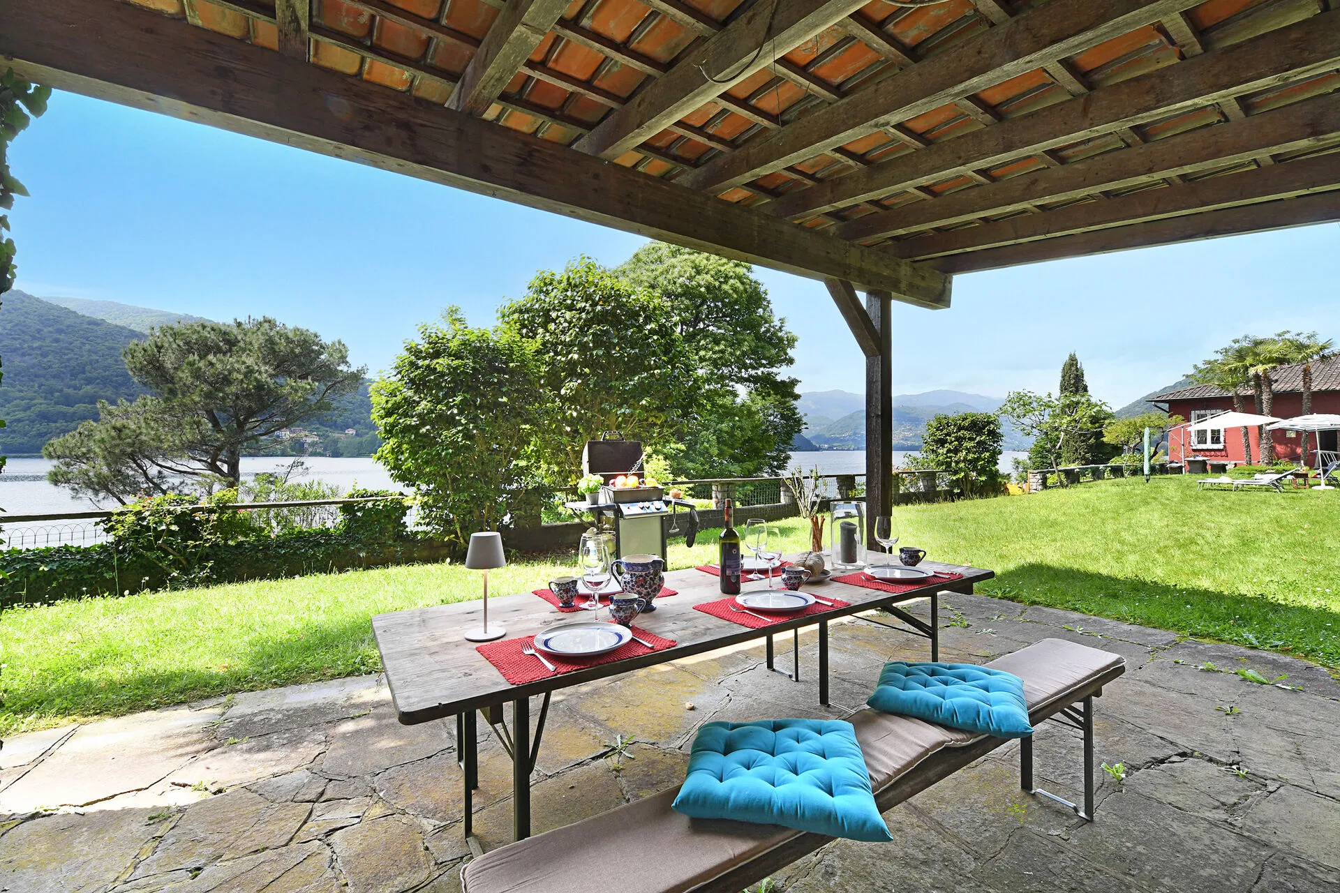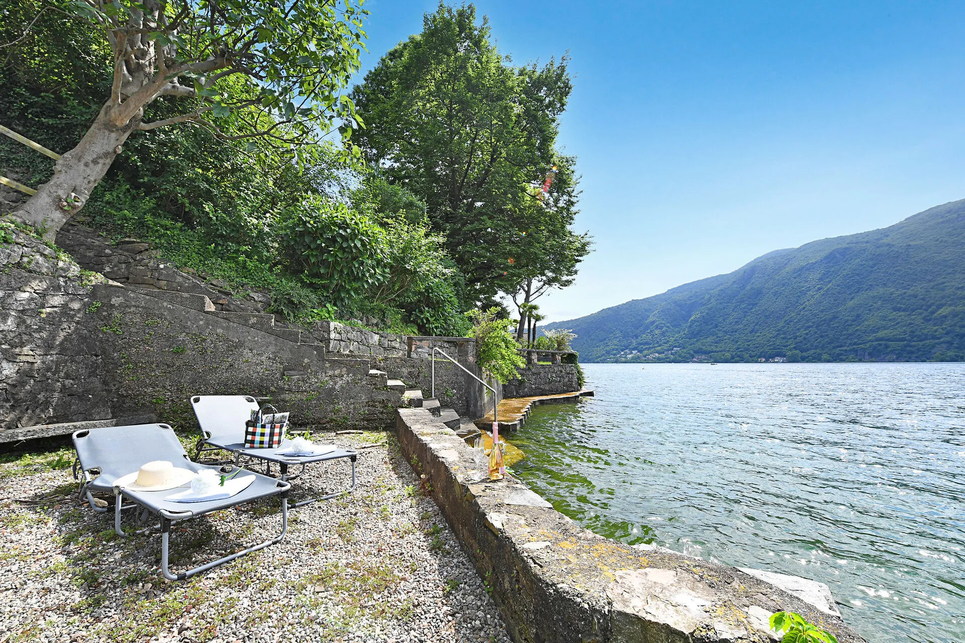 The highlight is private access to a verdant garden located across the street with a beach and lake, where you can bask in the sun or dine alfresco amidst the fragrant blooms overlooking the lake. The terrace provides a picturesque setting for morning coffees or evening aperitifs, all while overlooking the serene lake and majestic mountains.