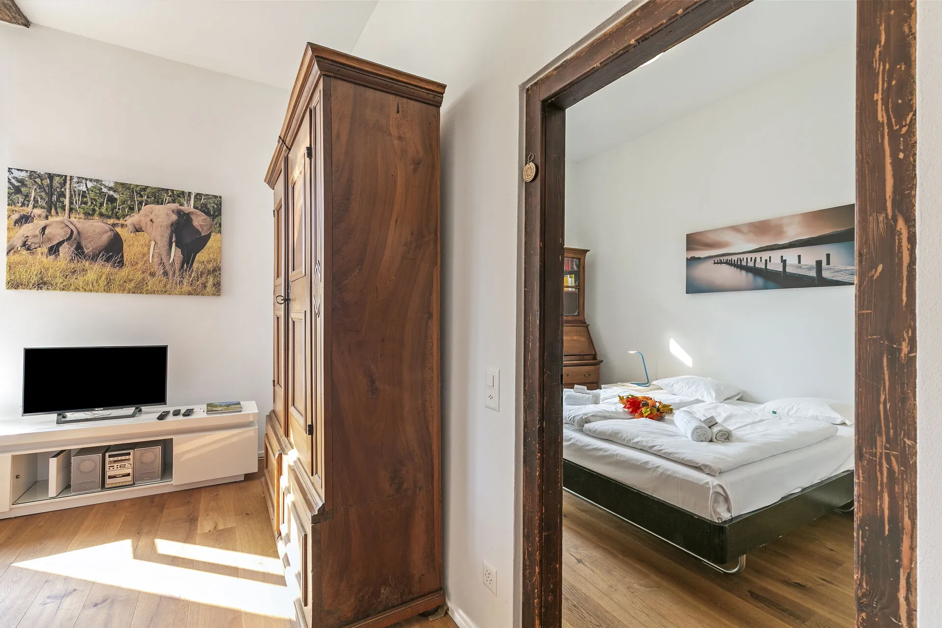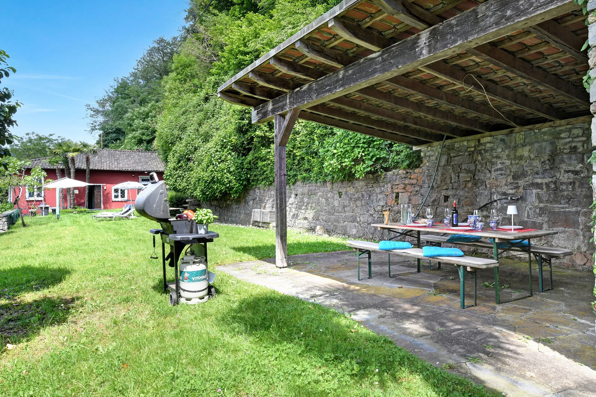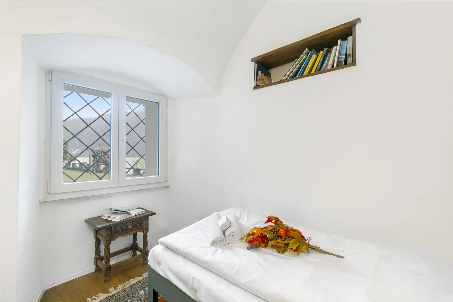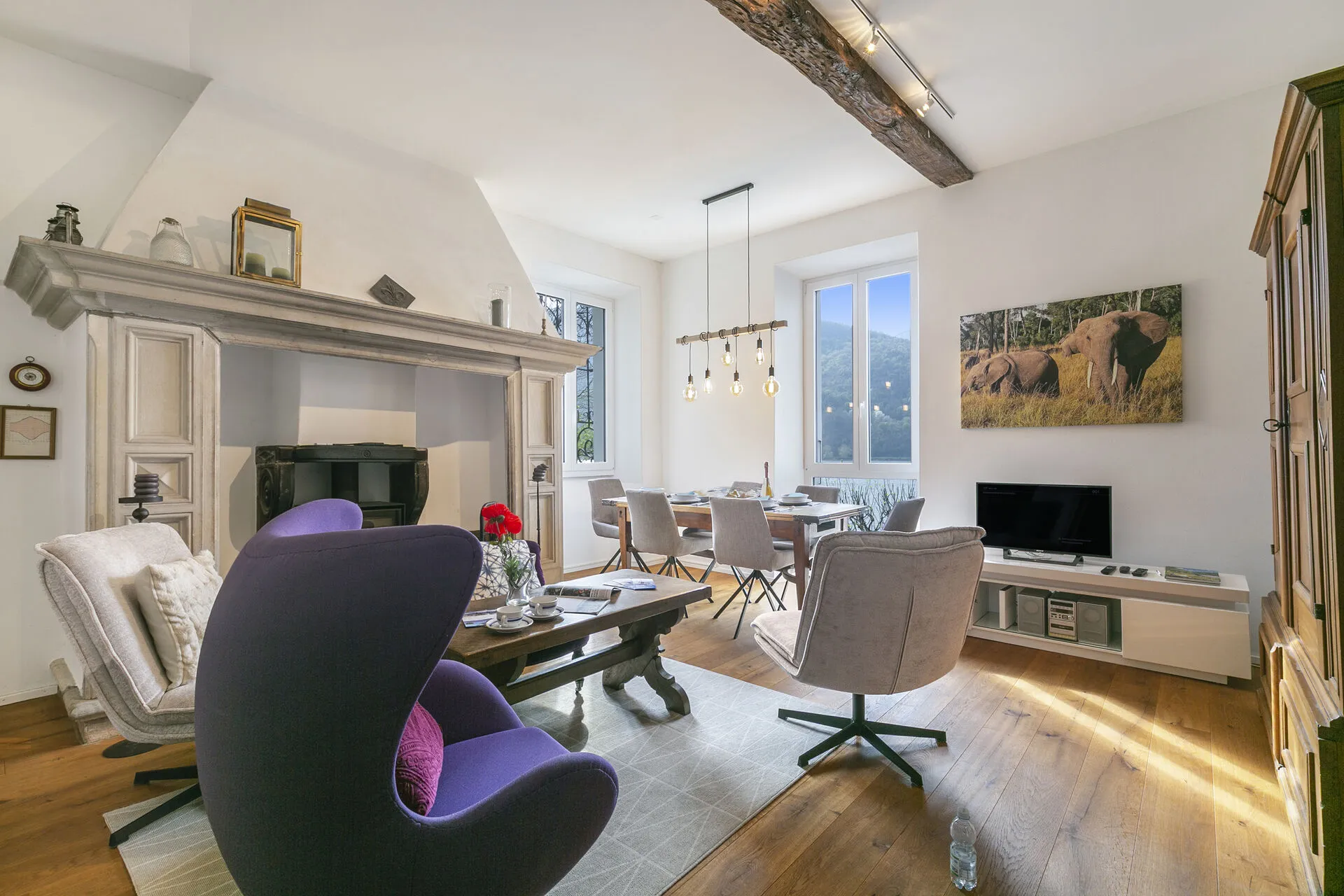 The highlight is private access to a verdant garden located across the street with a beach and lake, where you can bask in the sun or dine alfresco amidst the fragrant blooms overlooking the lake. The terrace provides a picturesque setting for morning coffees or evening aperitifs, all while overlooking the serene lake and majestic mountains.
