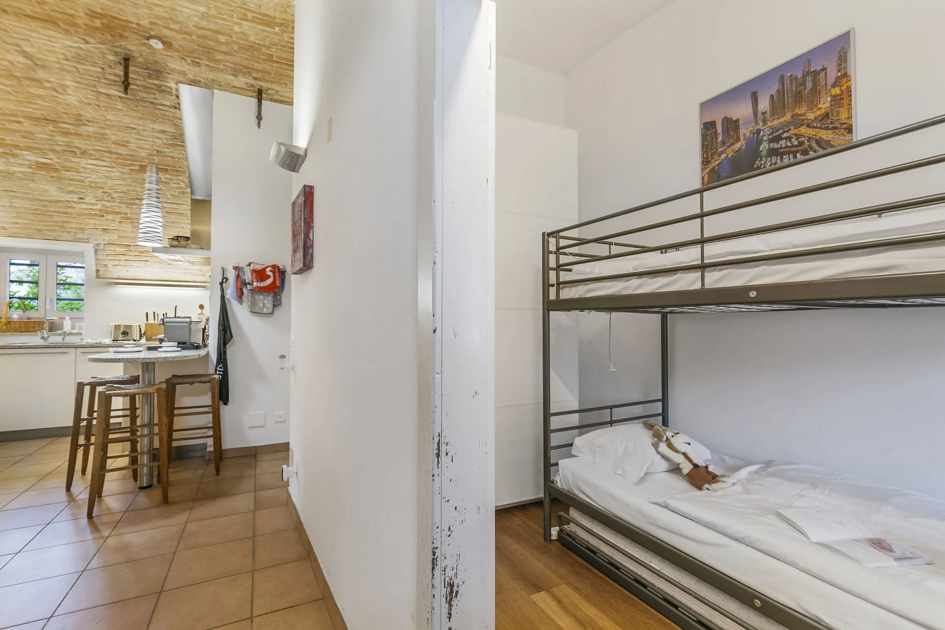 Bedroom 2: The second bedroom has a bunk bed and a wardrobe.