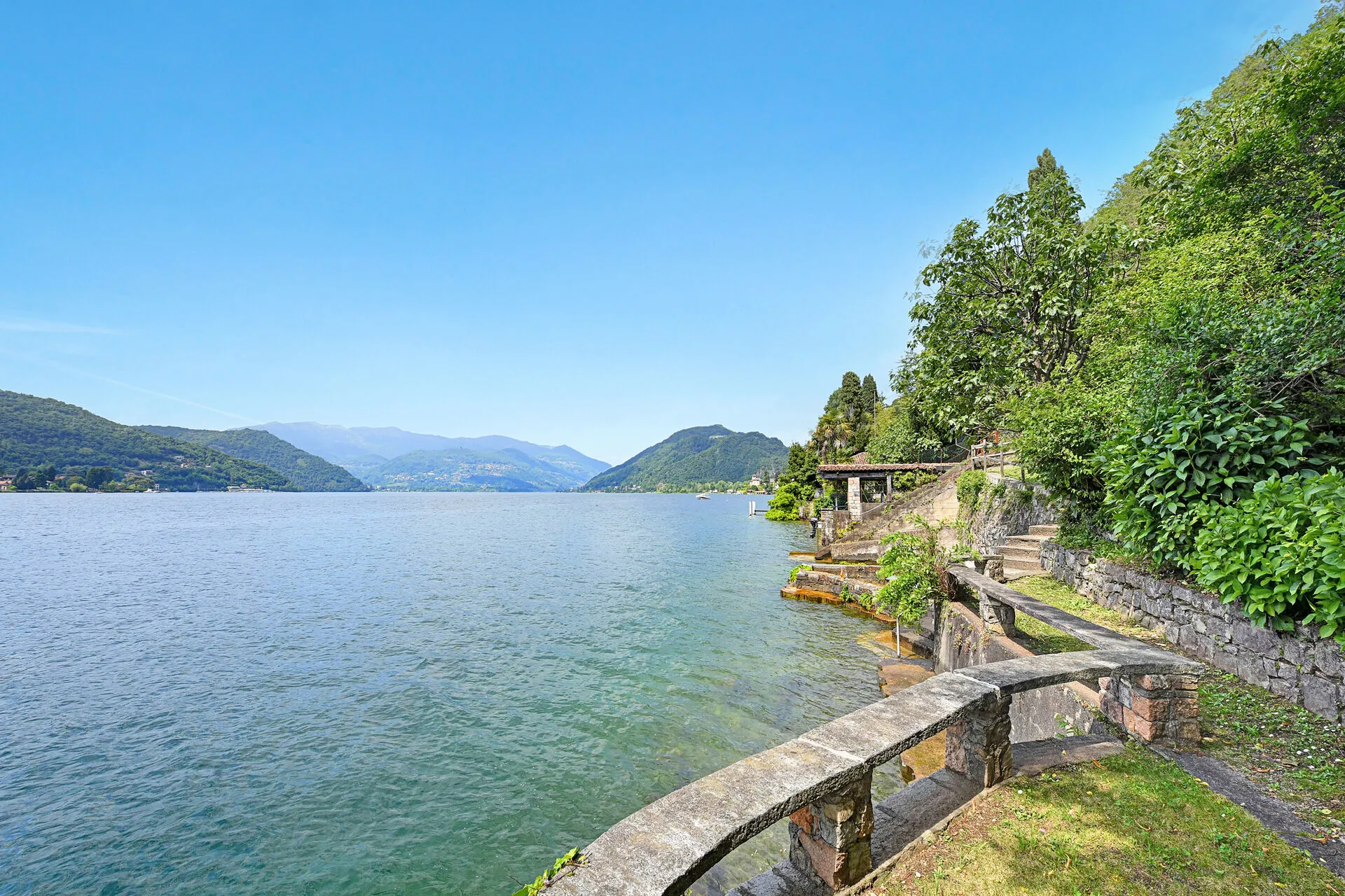 The villa is in the village of Morcote, on the southern tip of the Swiss side of Lake Lugano. The surrounding countryside is crossed with hiking paths ideal for enjoying this stunning landscape. Morcote is known as one of the most beautiful villages in Switzerland, with its elegant buildings, some of which date back to the 15th century. The Church of Santa Maria del Sasso (a 4-minute drive) is a peaceful hilltop sanctuary offering panoramic views, beautiful frescoes, and a serene atmosphere perfect for quiet reflection. Scherrer Park (a 3-minute drive) is dotted with lemon trees, bamboo groves and statues inspired by classical myths in the grounds of a hillside villa; it feels like a walk in paradise.
