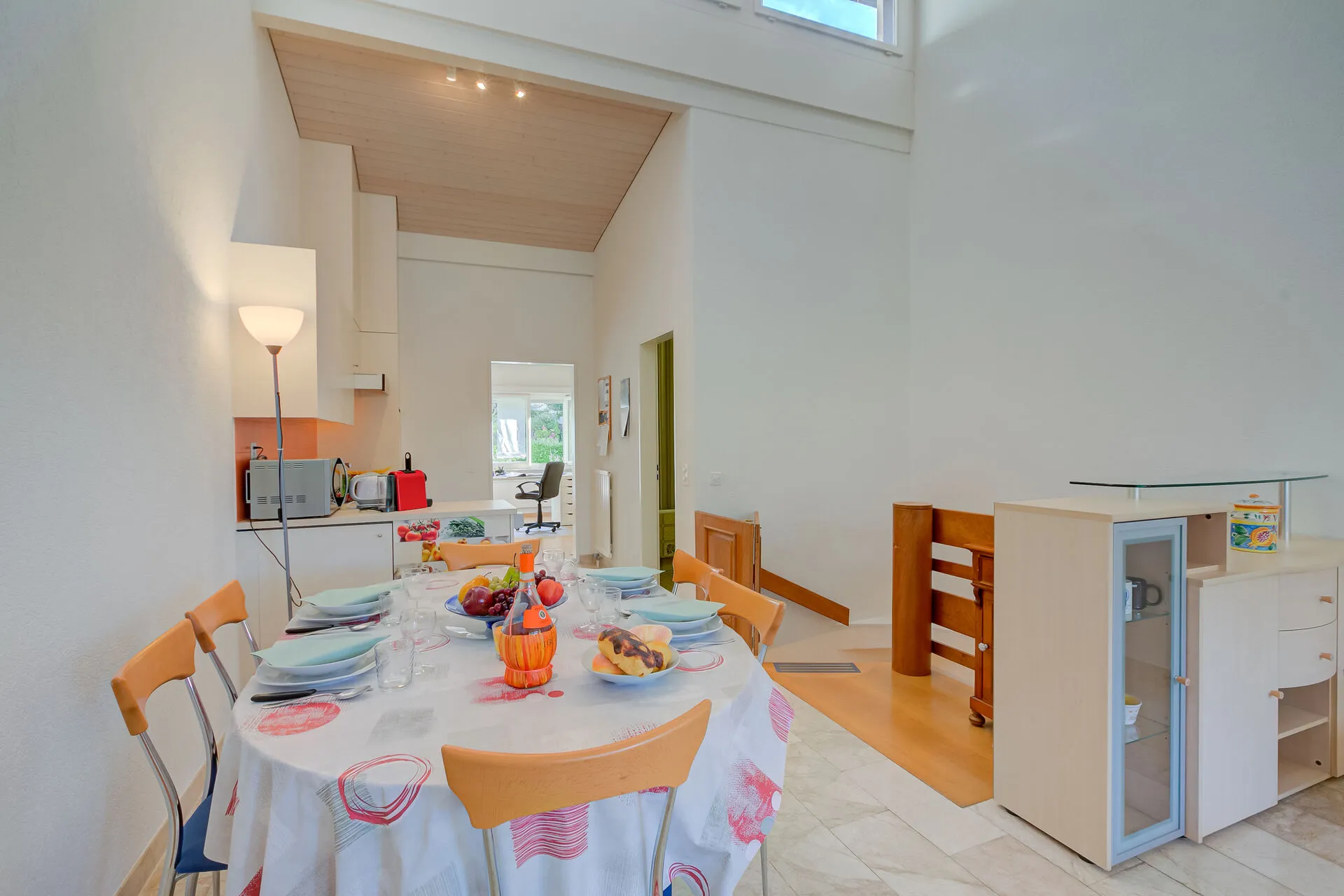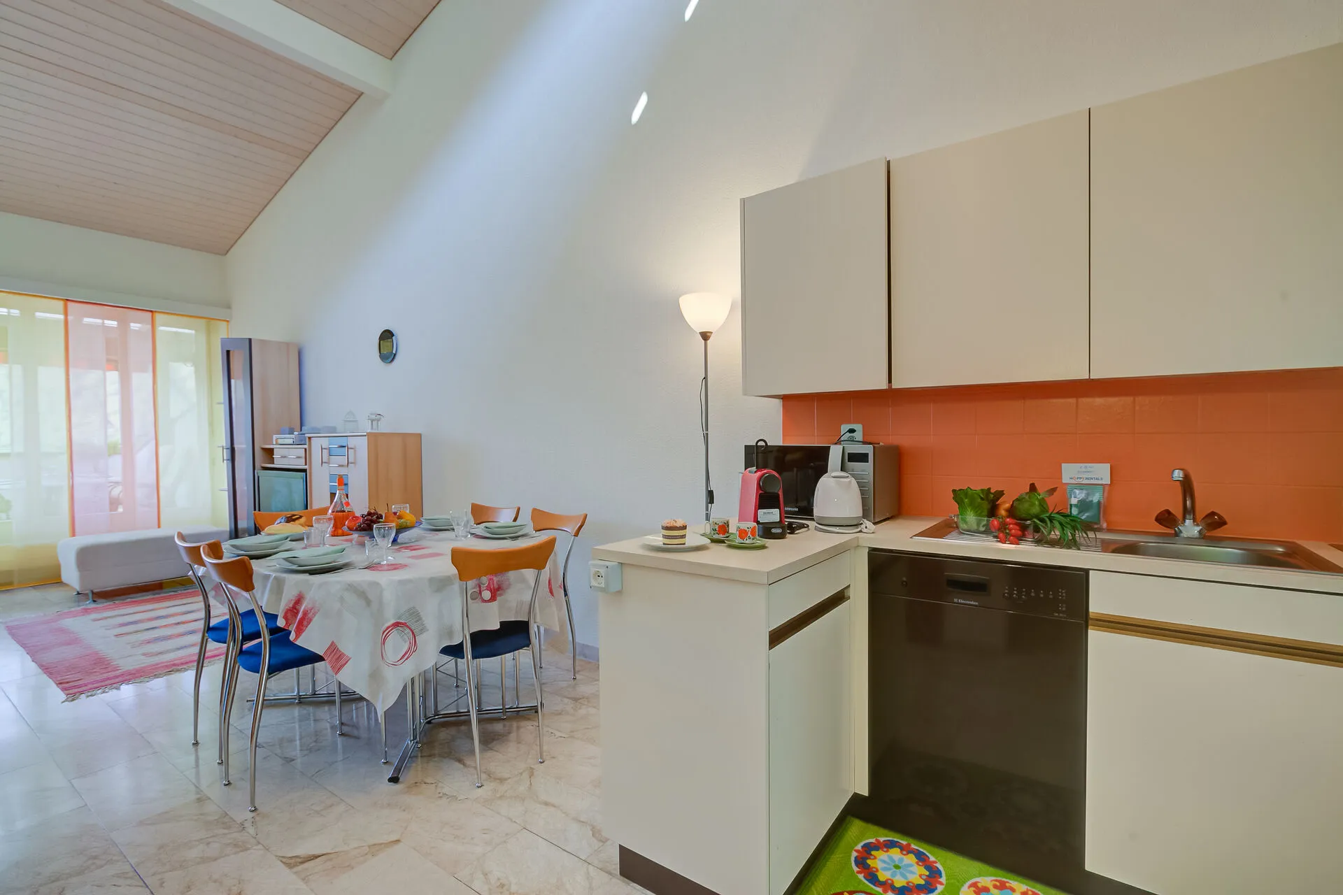 The entrance is on the ground floor with the main living space on the first floor. The light-filled living/dining room with a high, pitched ceiling has large glass doors leading out onto a private balcony with uninterrupted lake views. The balcony is furnished with a dining table and chairs, for relaxed meals al fresco. Back inside, the seating area is furnished with an L-shaped sofa and a flat-screen TV. Next to this, there is a dining table with 4 chairs. The open-plan kitchen is well-equipped with a cooker hob, oven, microwave, fridge, freezer, dishwasher and a Nespresso coffee machine.