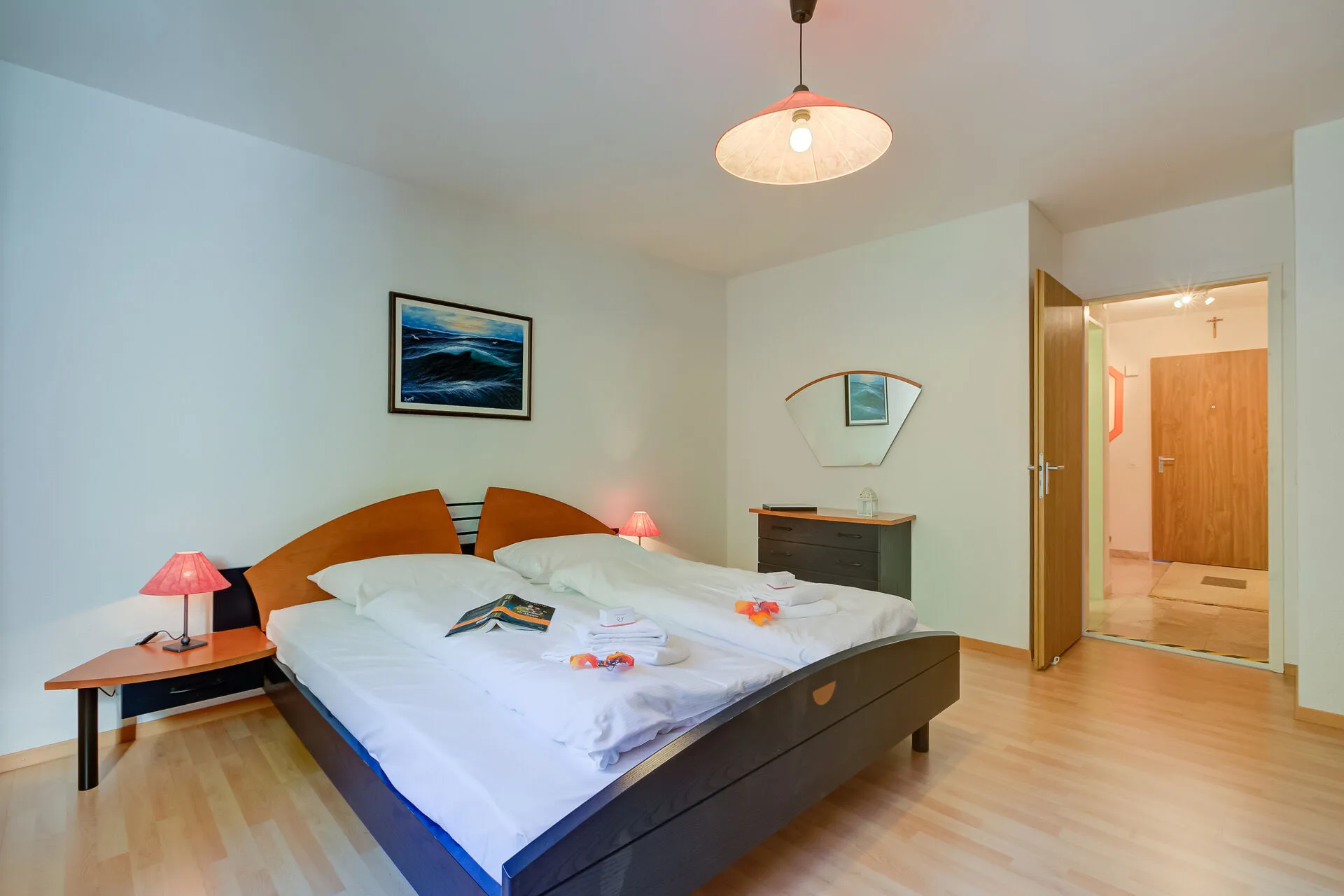 Bedroom 1: The ground-floor bedroom is furnished with a double bed and wardrobes.