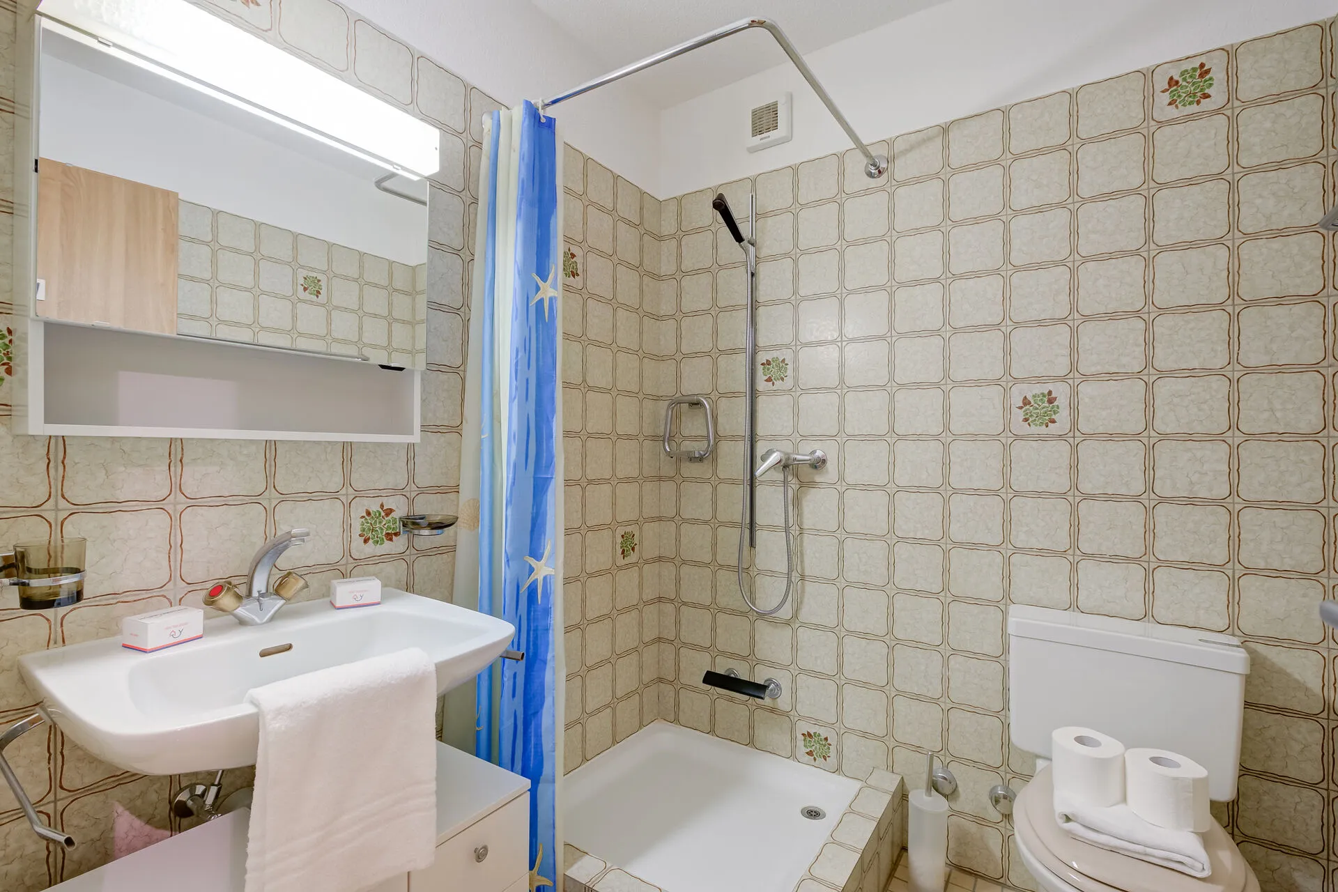 Bathroom 1: The bathroom upstairs is equipped with a full bath with a shower, basin and WC.
