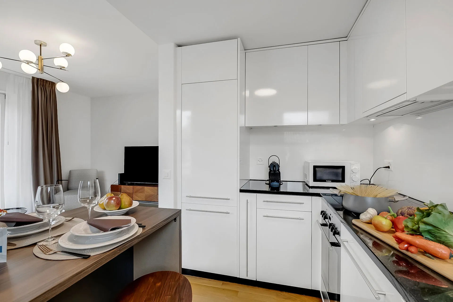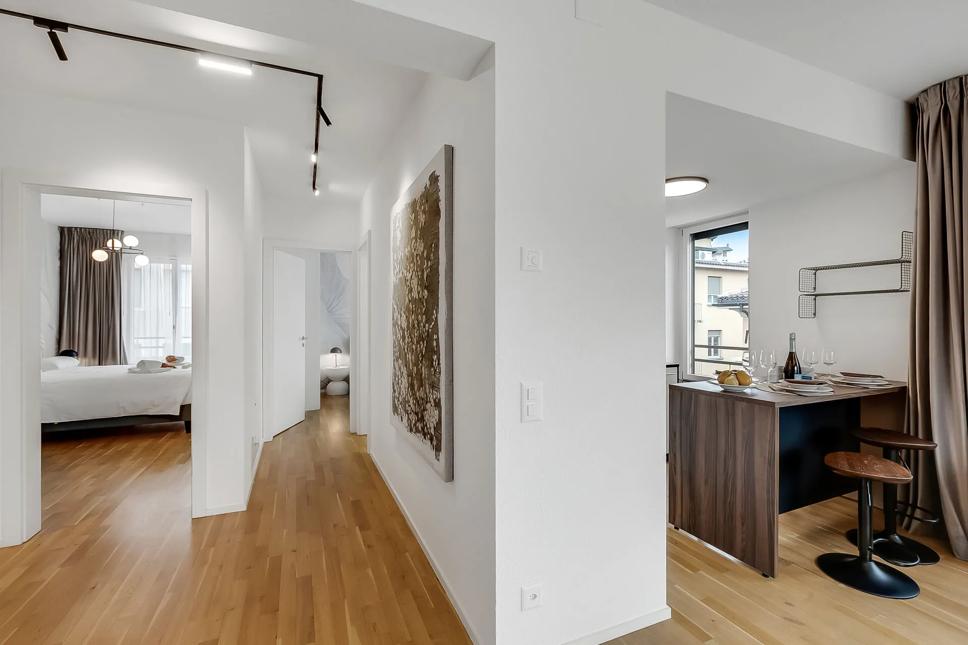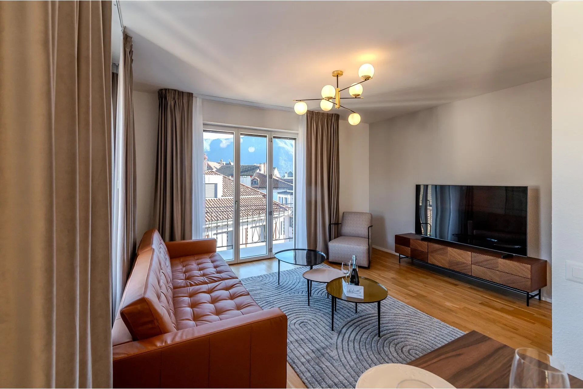 The apartment is stylishly appointed with everything guests need for a comfortable stay, whether you are in Lugano for business or an exciting city-break. The living area has a comfortable sofa, a flat-screen TV plus a dining table and chairs. The modern kitchen is off the living room, separated by a breakfast bar. It is well-equipped with a cooker hob, oven, microwave, dishwasher, fridge/freezer and Nespresso machine.Glass doors lead from the kitchen out to a private balcony.