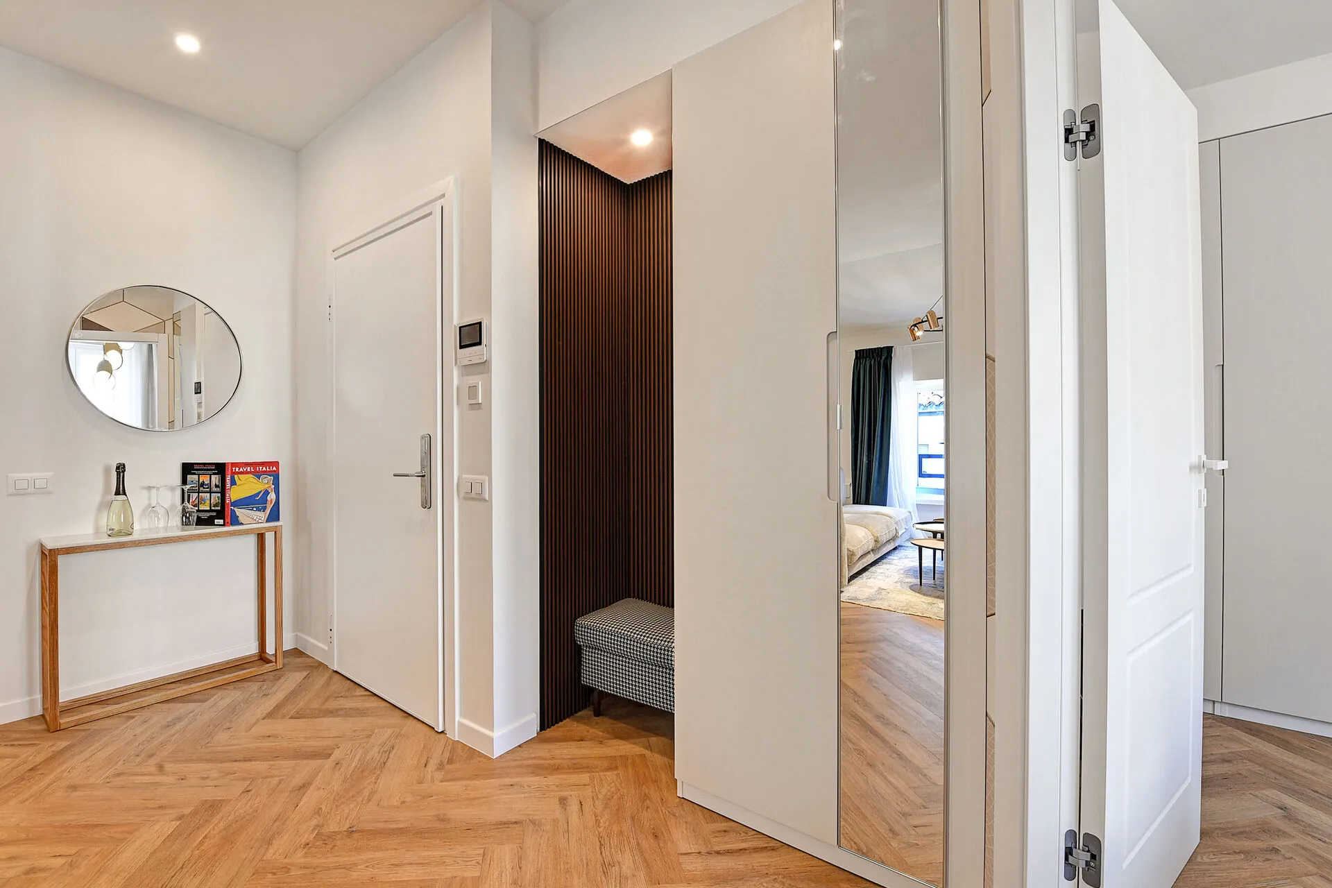 The open-plan living and dining area is thoughtfully furnished with a comfortable sofa, an armchair, a coffee table, and a flat-screen TV, making it perfect for unwinding after a day of exploration. Adjacent to this space, is an open kitchen, fully equipped with a cooker hob, an oven, coffee machine, a microwave, a dishwasher, a fridge with a freezer, and a Nespresso machine for your morning coffee. For remote workers, a laptop-friendly workspace provides the convenience needed to stay productive while enjoying the vibrant surroundings.