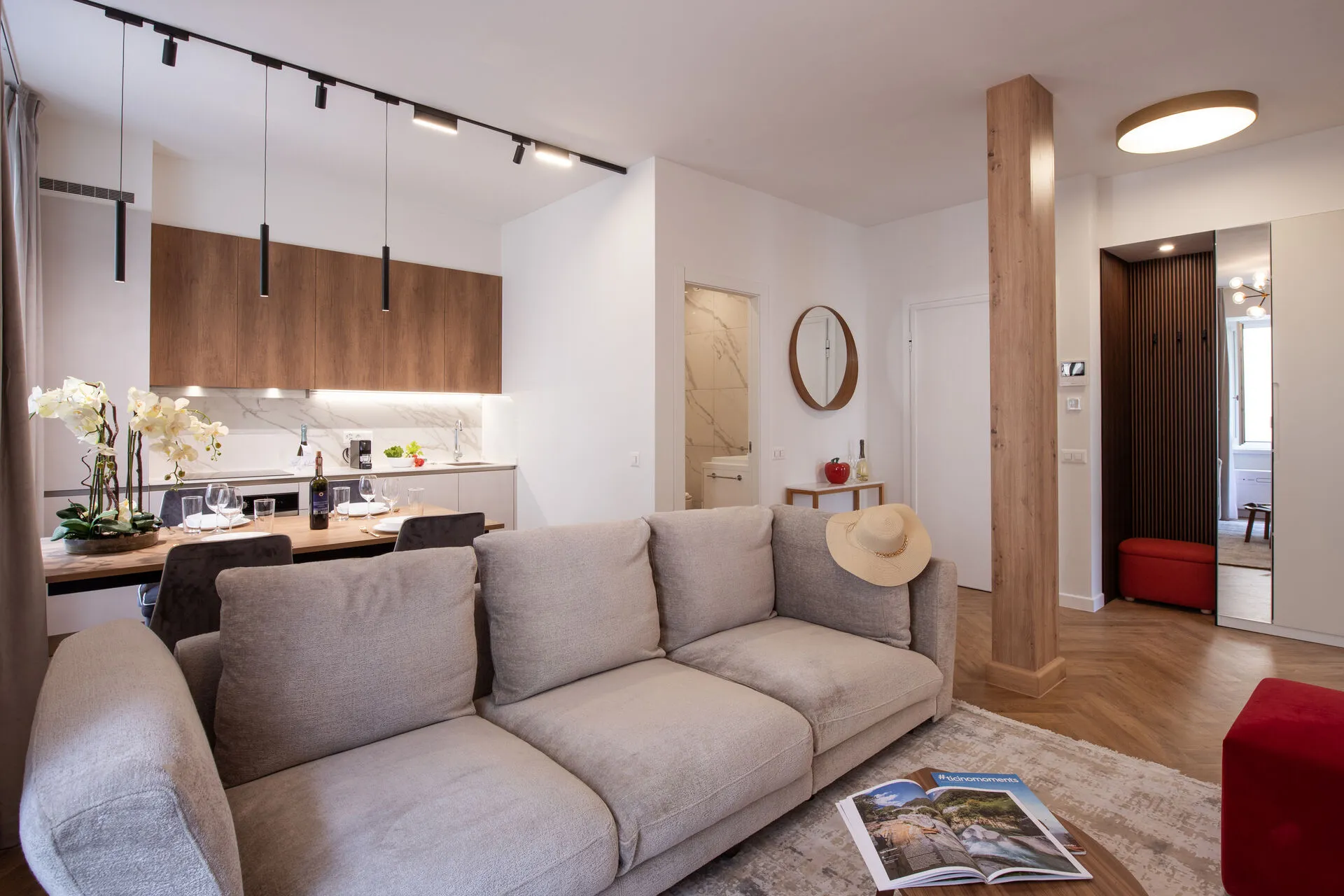 This modern apartment is perched on the 3rd floor of a 4-story building. The bright open living area has a sofa, smart TV and dining space. The kitchen features essential appliances including a Nespresso coffee machine, dishwasher, electric kettle, microwave, oven, toaster, and full fridge. Free Wi-Fi and laptop-friendly workspace ensure comfort for remote working.