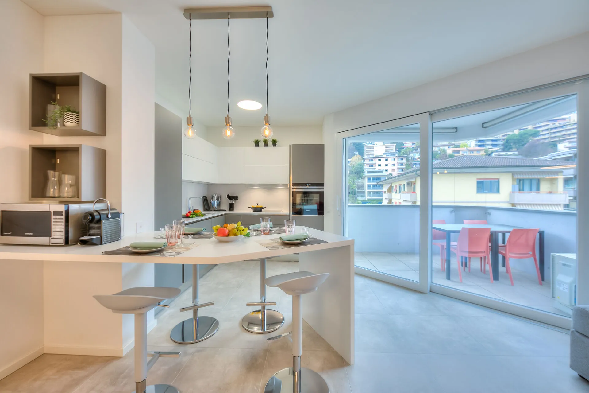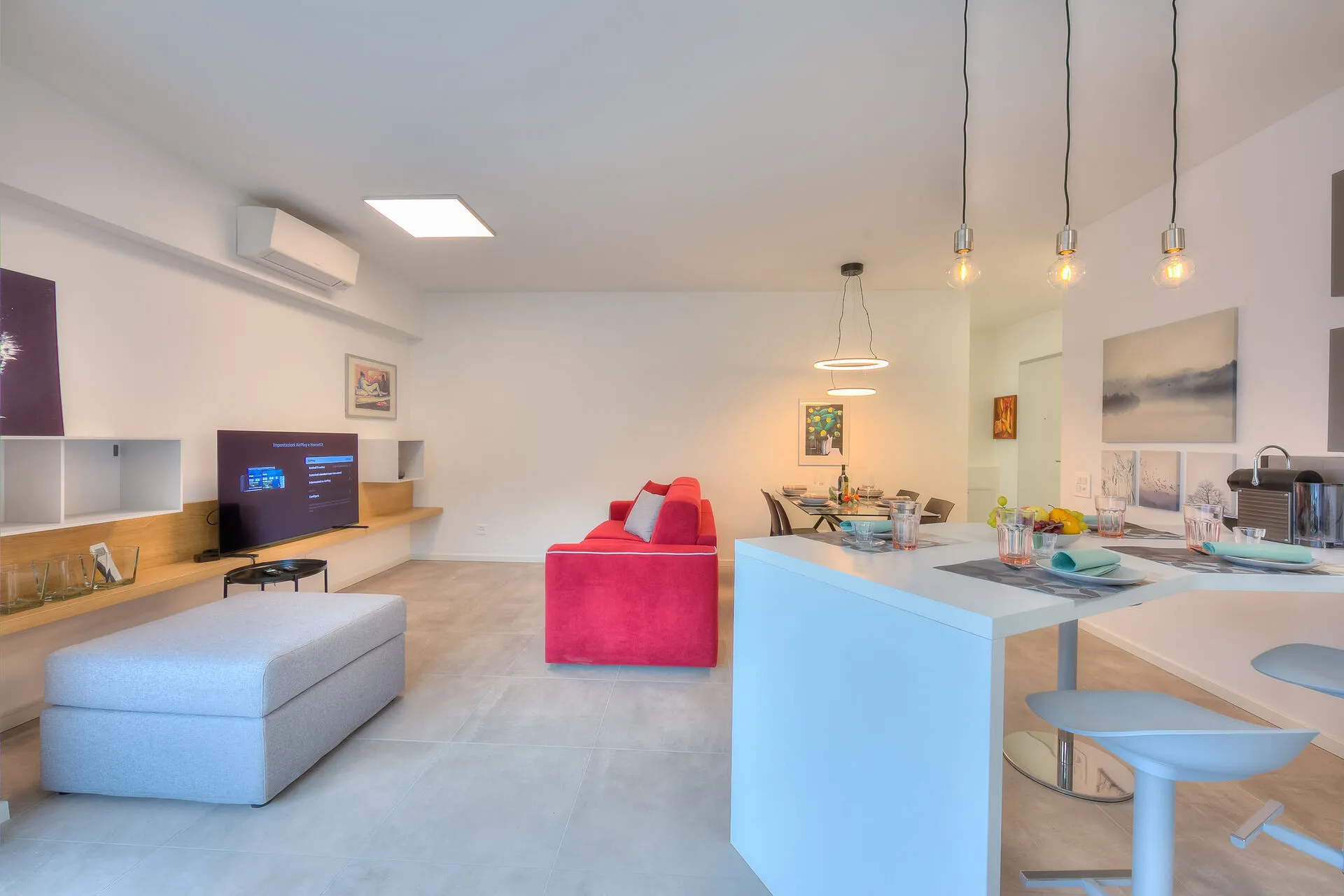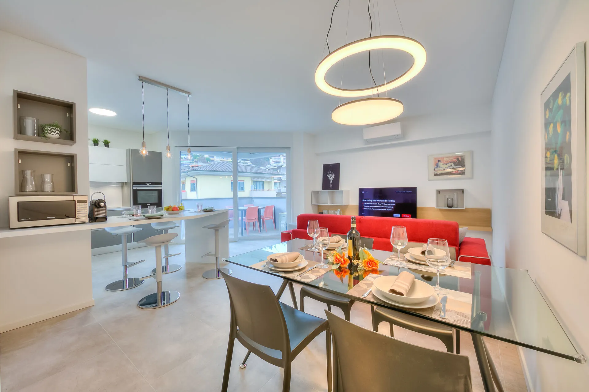 Opening directly onto the terrace through floor-to-ceiling, glass sliding doors, the contemporary, open-plan living space incorporates both the kitchen and dining room. This area has been furnished with a comfortable sofa bed, a coffee table, a flat-screen HDTV and a dining table for four. The fully-fitted kitchen is well equipped with a dishwasher, microwave, oven, induction hob, Nespresso machine, fridge and a breakfast bar with four stools.