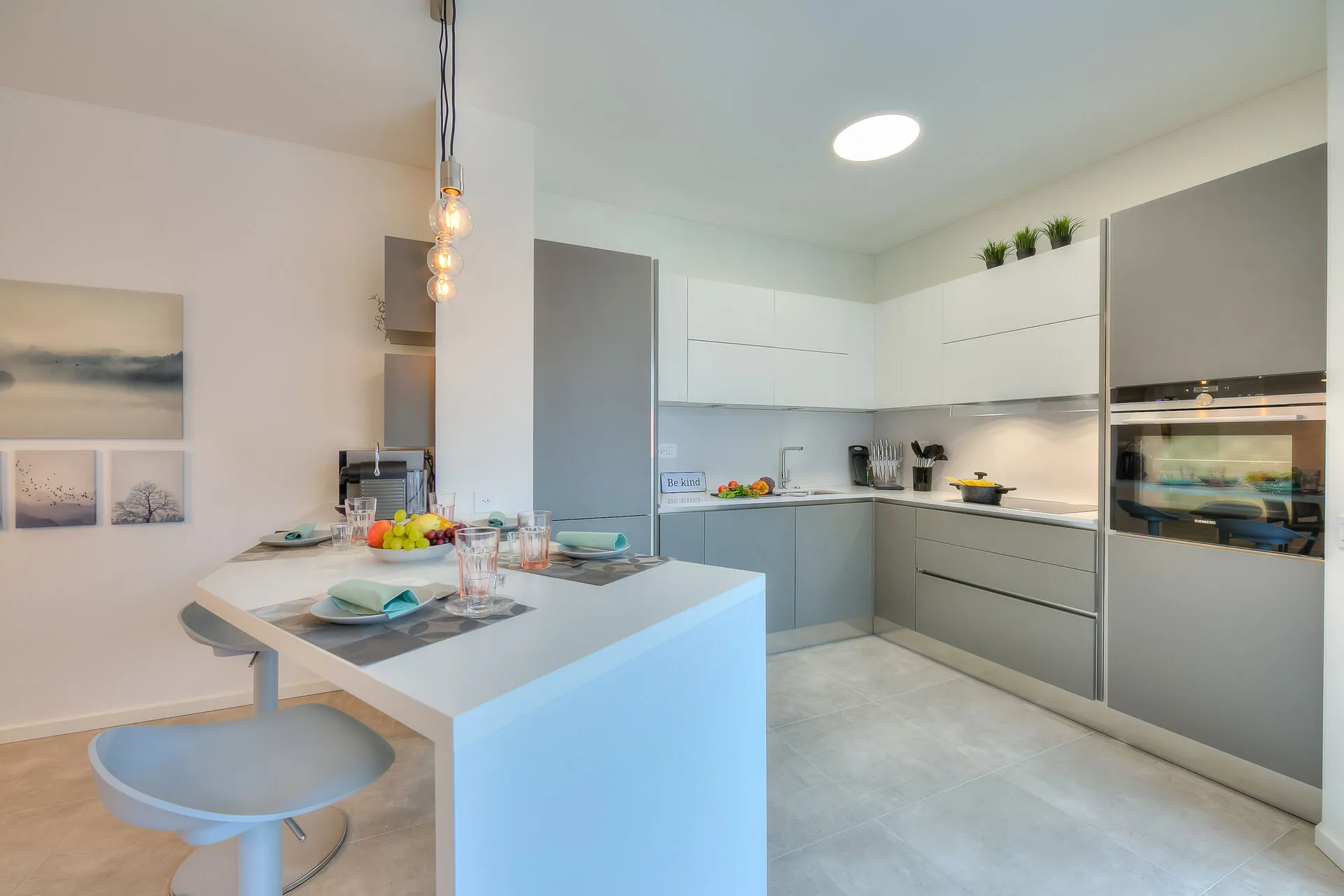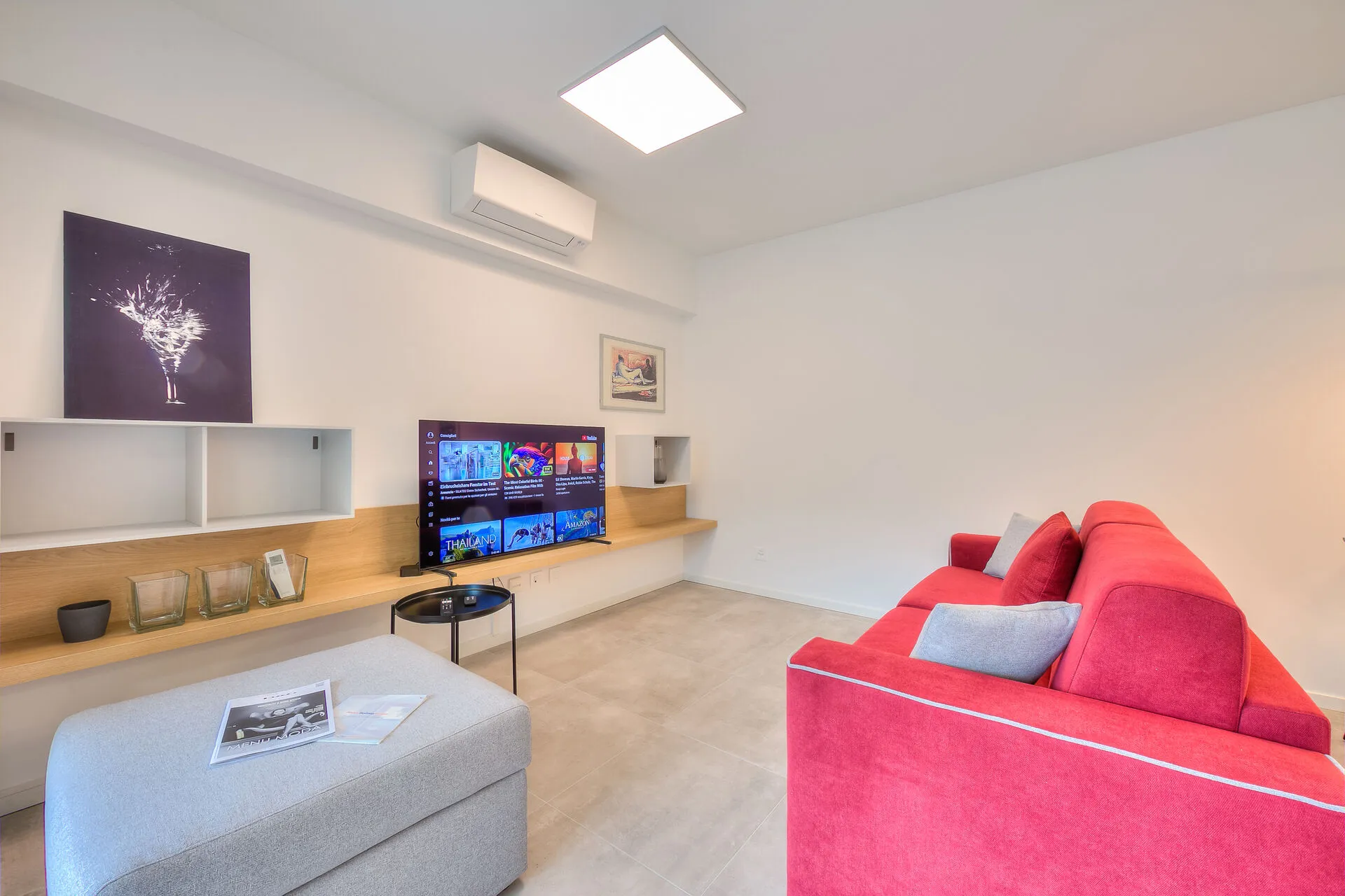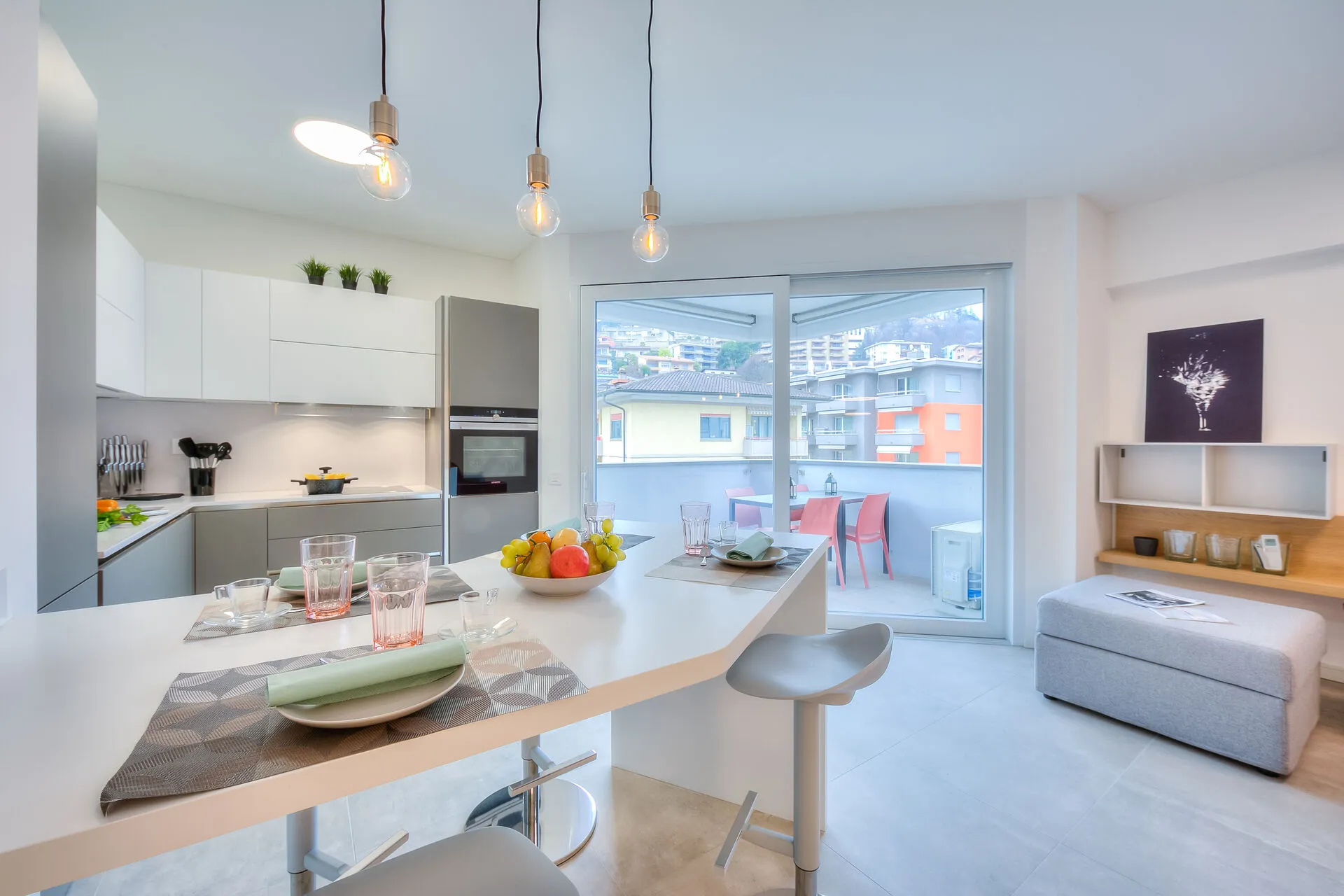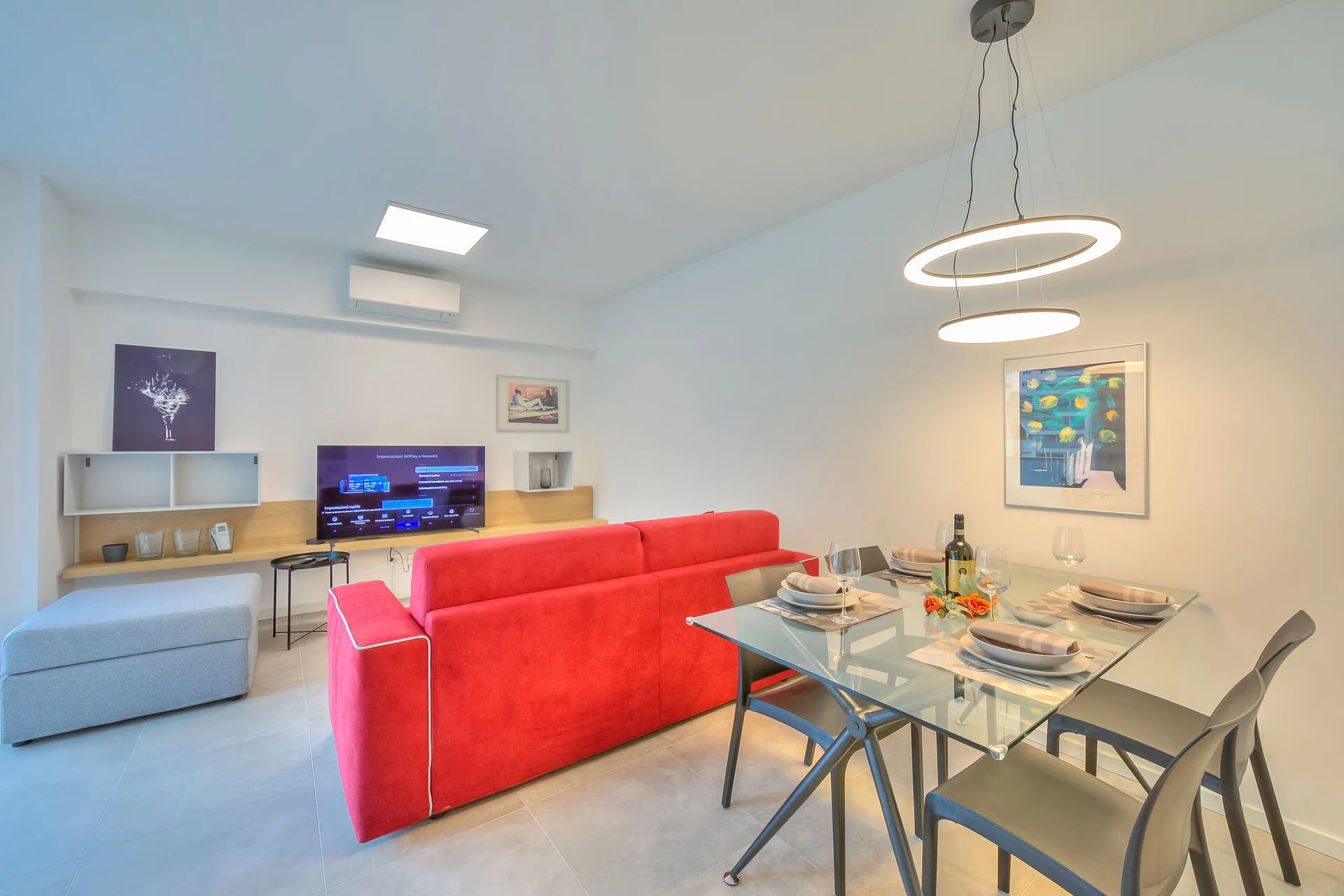 Opening directly onto the terrace through floor-to-ceiling, glass sliding doors, the contemporary, open-plan living space incorporates both the kitchen and dining room. This area has been furnished with a comfortable sofa bed, a coffee table, a flat-screen HDTV and a dining table for four. The fully-fitted kitchen is well equipped with a dishwasher, microwave, oven, induction hob, Nespresso machine, fridge and a breakfast bar with four stools.