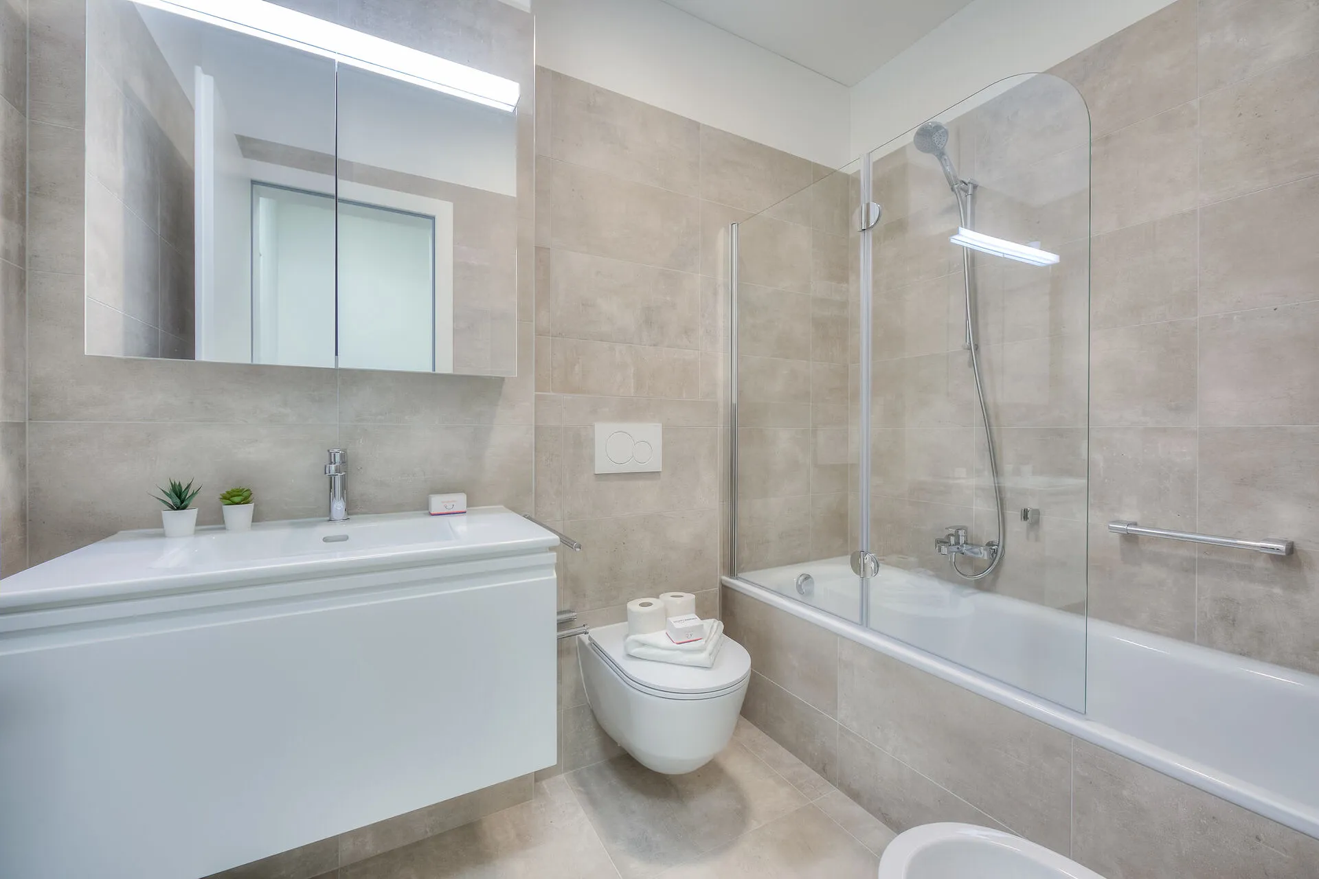 Bathroom: The modern bathroom is fitted with a shower in bath, bidet, washbasin and WC