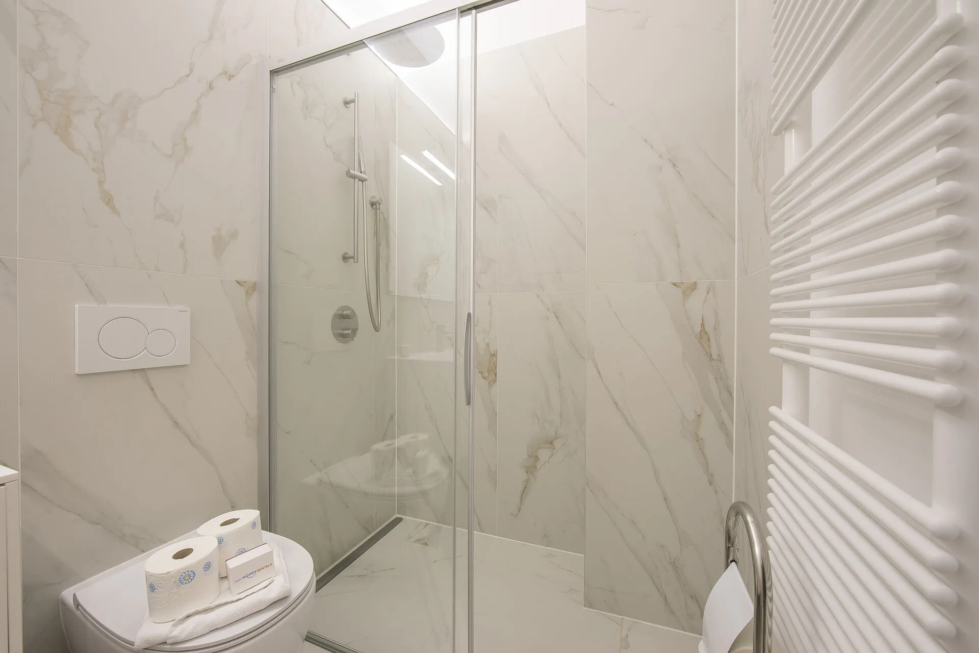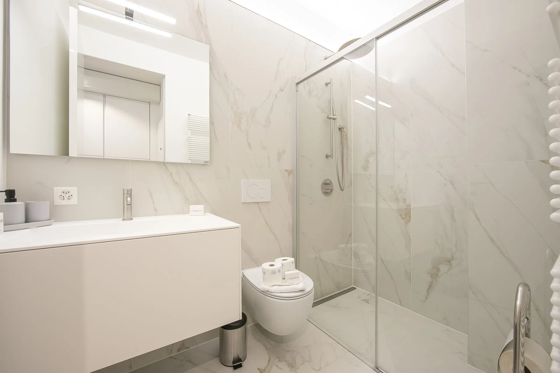 Bathroom 1: The luminous and marbled modern bathroom has a shower and WC.