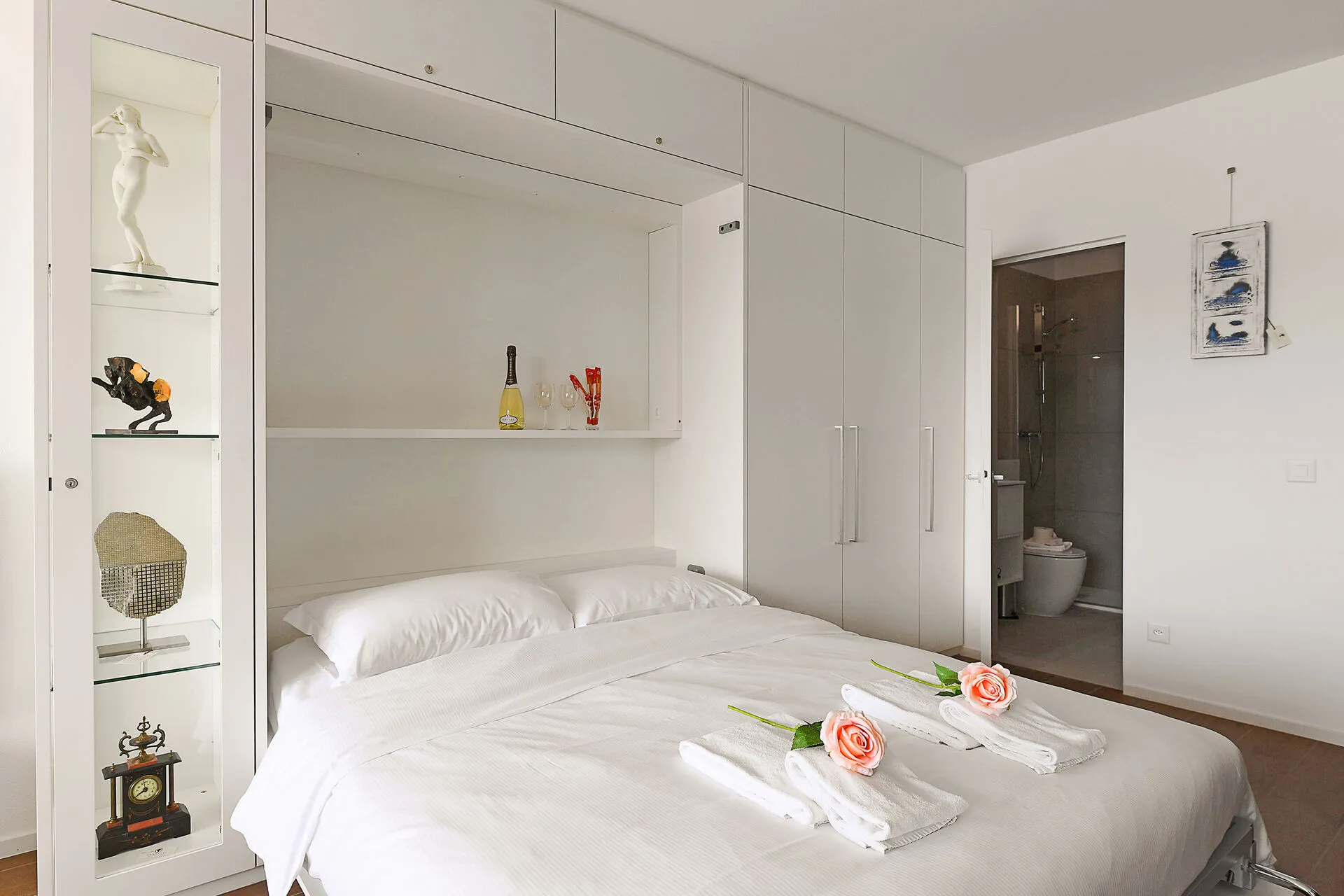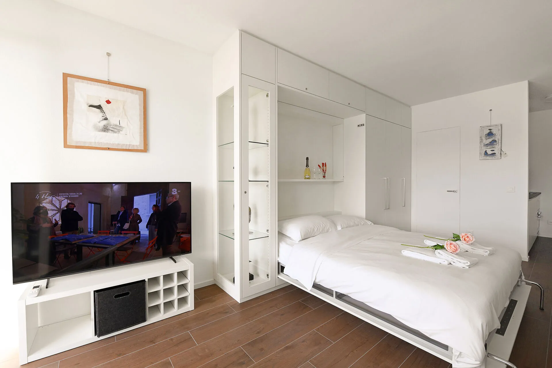 In the living area there are a double bed and a sofa double bed, plus a wardrobe for storage.