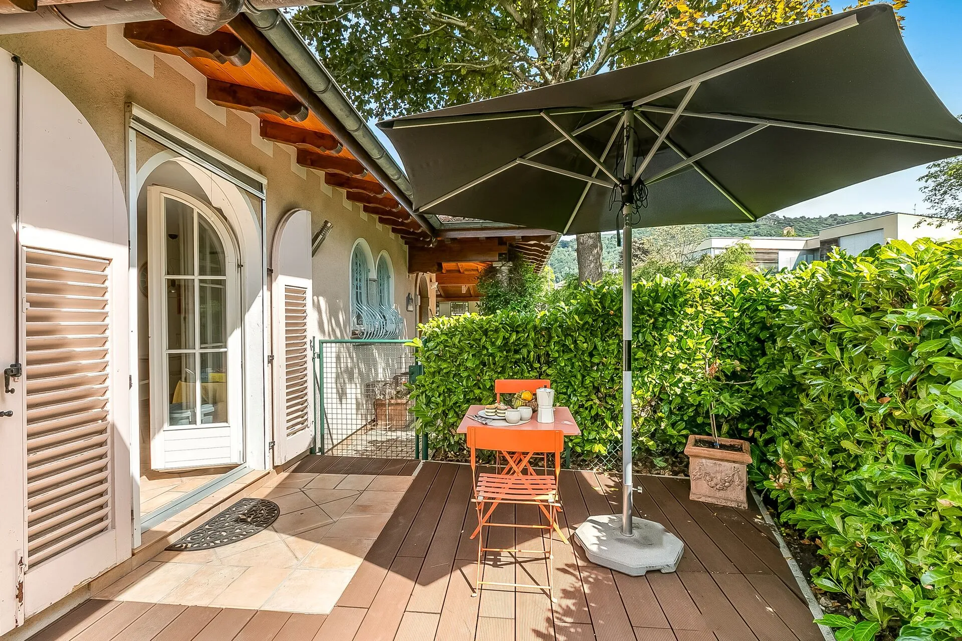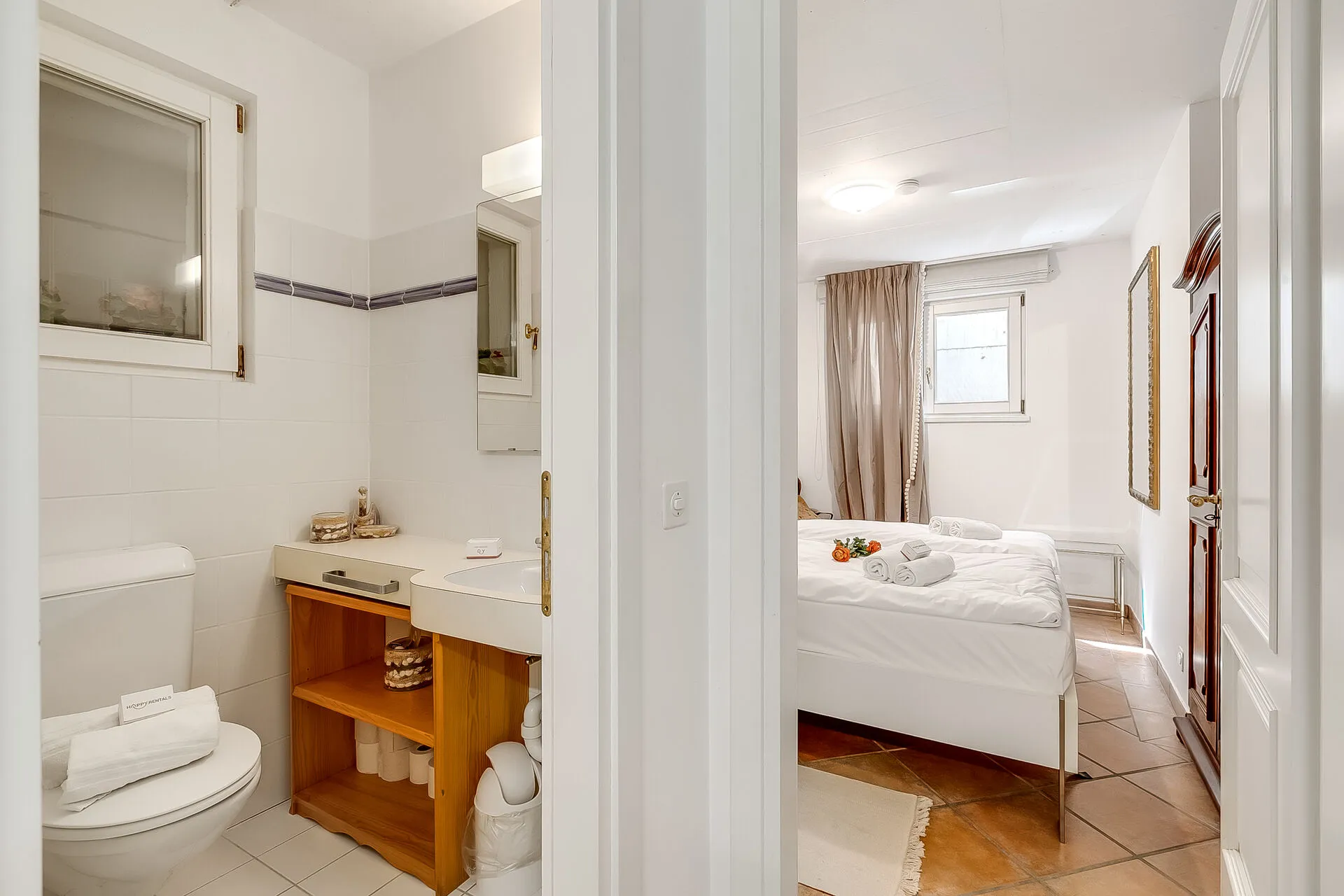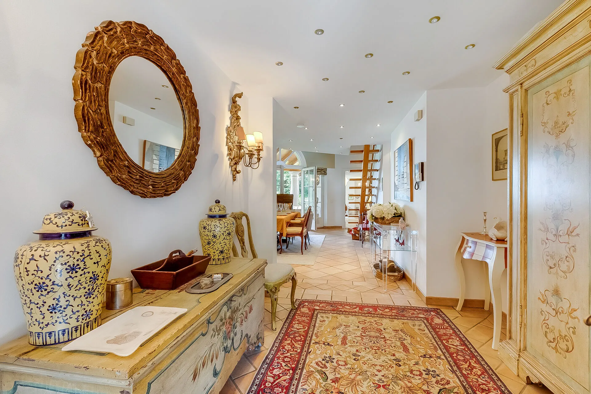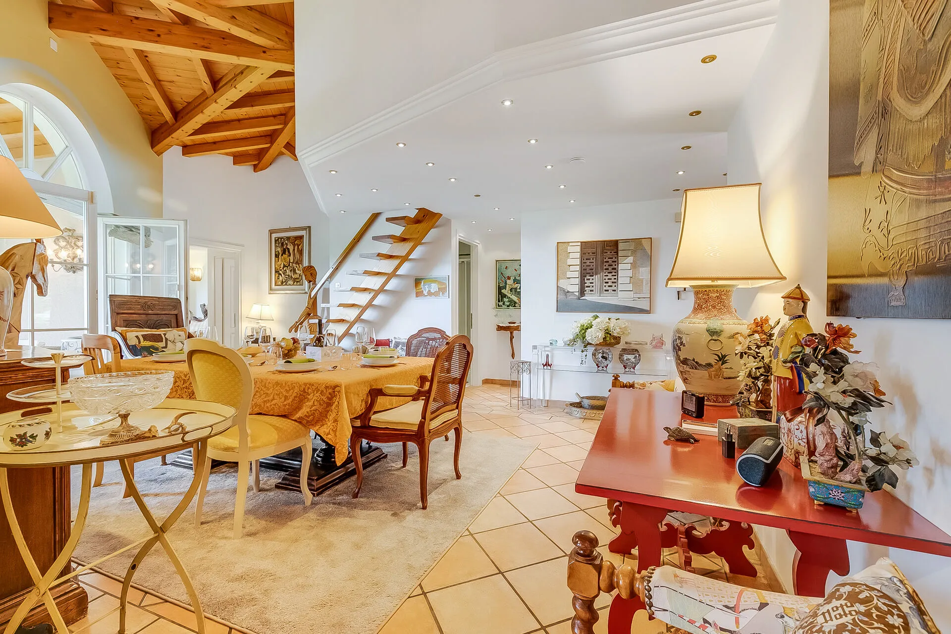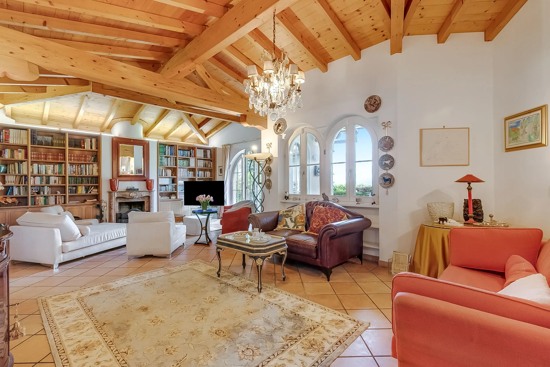 The stunning open-plan living room is full of light thanks to French windows which open onto the shaded terrace. The high, beamed ceilings give the room an airy ambience. The furniture is a charming combination of contemporary and antique pieces, comfortable sofas and armchairs, with a large, flat-screen TV and an extensive library.
