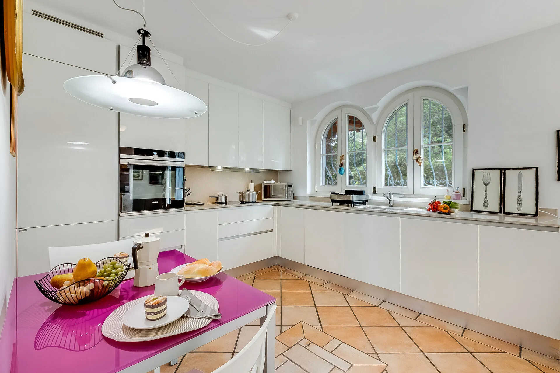 Back downstairs, the white, contemporary kitchen is off the living area, close to the dining room. It is well-equipped with an induction hob, oven, microwave, dishwasher, fridge-freezer, toaster and a Nespresso coffee machine. There is a separate kitchen for preparing dog food and a laundry room on the lower ground floor.